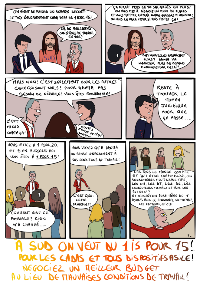 Nous avons découvert que notre Direction (Adoma, ex-Sonacotra) avait oeuvré à faire renoncer le Ministère de l'Intérieur à un nouvel arrêté publié en février dernier et améliorant le nombre de salariés en CADA (centres d'accueil de demandeurs d'asile). Nous dénonçons ce fonctionnement honteux, qui va à l'encontre des demandeurs d'asile et des salariés.