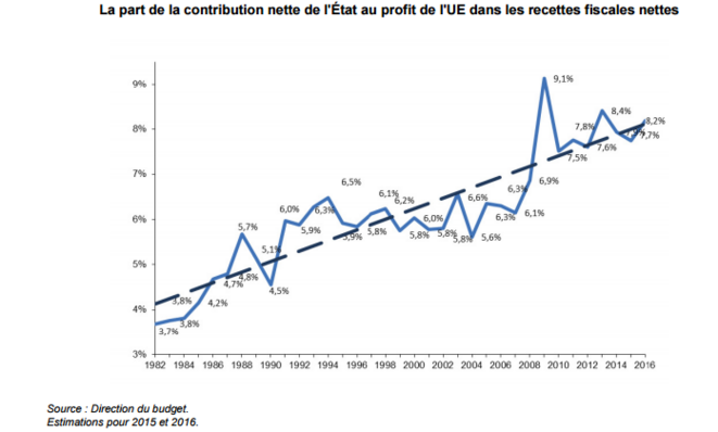 Cette croissance ne date pas de 2010. Depuis 30 ans, nous payons de plus en plus, de façon systématique si l'on fait abstraction des variations ponctuelles annuelles.En 2016, il est prévu que nous paierons un montant qui constituera un nouveau record, sans doute 24 Md€ car le montant prévisionnel (23,4 Md€) sera très probablement dépassé, l'UE s'étant engagée dans de nouvelles dépenses qui n'avaient pas été budgétées. Cette contribution au budget de l'UE représente une fraction toujours croissante des recettes fiscales de l'Etat et représente désormais 8% d'entre elles. Le graphique ci dessous illustre le poids croissant de cette ponction au sein des reccettes fiscales : depuis 1982, le ratio a doublé, passant de 4 à 8%...