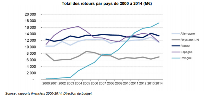 Alors que les français paient de plus en plus, ce que nous recevons de l'UE stagne depuis une quinzaine d'années comme le montre l'évolution des retours qui figure dans le graphique ci-dessous. Nous avons ainsi récupérés un peu moins de 14 Md€ en 2014. L'immense majorité des français n'a pas vu la couleur d'un seul €uro en terme de retour car l'essentiel de ceux-ci est constitué de subventions versés aux agriculteurs dans le cadre de la politique agricole commune (8,5 Md€), lesquelles sont elles mêmes principalement versées aux grands céréaliers et béteraviers qui n'ont nul besoin de subventions pour vivre. La Pologne est le membre de l'UE qui reçoit le plus d'argent issu du budget de l'UE: de presque rien jusqu'en 2003 et des montants qui croissent considérablement ensuite au point d'atteindre presque 18 Md€ en 2014, ce quu n'empêche pas la Pologne de faire preuve d'une solidarité minimale vis à vis des autres membres de l'UE et d'acheter presque toutes ses fournitures militaires aux Etats Unis.
