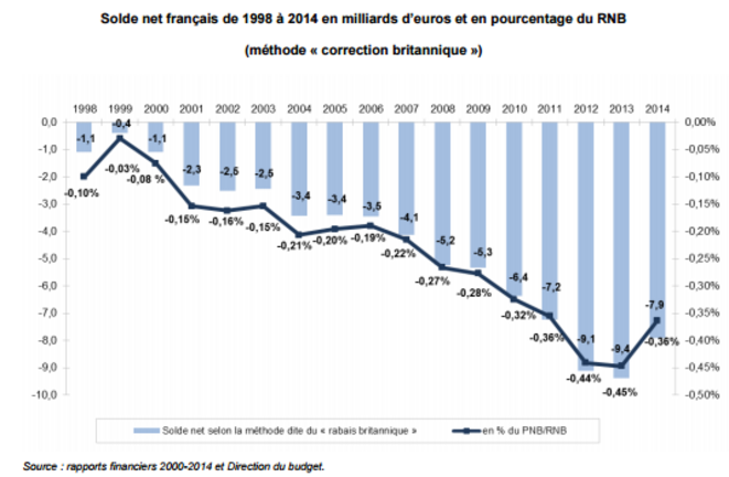 Les Français sont les vaches à lait de l'UE : nous payons un maximum pour le budget de l'UE, les retours (c'est à dire ce que l'UE verse aux français) stagnent, de sorte que nous somme un contributeur, et même le plus important contributeur de tous les Etats membres de l'UE, à la seule exception de l'Allemagne.