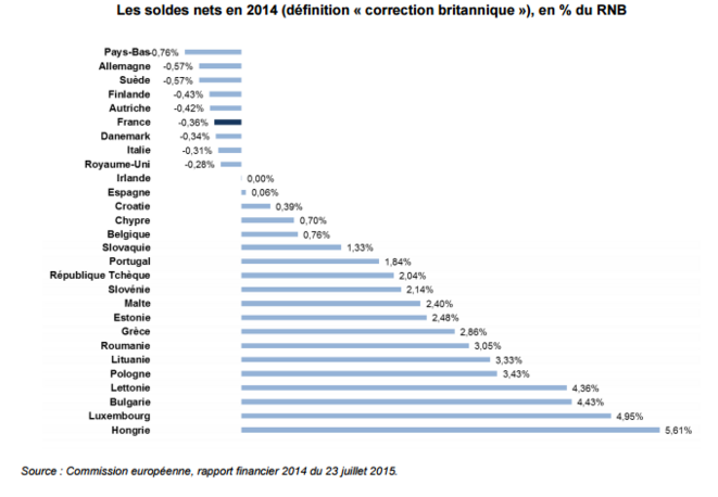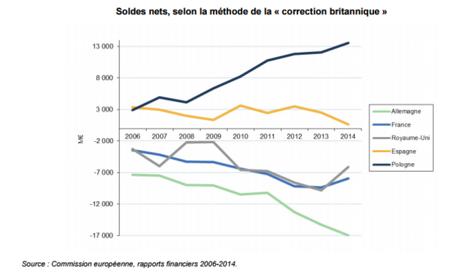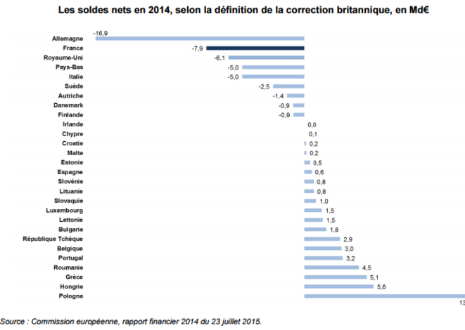 La différence entre la contribution nette au budget de l'UE et les retours est un solde qui est soit positif pour le pays -et il bénéficie directement de son appartenance à l'UE- soit négatif et il est alors perdant. Comme on peut le constater sur le graphique ci-dessous, en 2014, le solde net pour la France était de -7,9 Md€, au deuxième rang de l'esnemble de l'UE derrière l'Allemagne, et avant le Royaune Uni à qui l'appartenance à l'UE coûte 6,1 Md€ en 2014 (et coûterait encore plus si Thatcher n'avait obtenu en 1984 un mécanisme, toujours en vigueur, permettant de limiter de limiter ce coût). Les bénéficiaires des transferts les plus importants sont les pays d'Europe orientale et la Grèce, mais la Polologne est de loin le bénéficiaire le plus important.