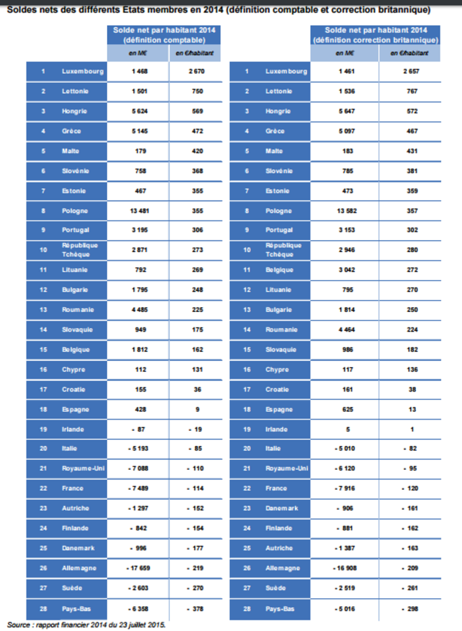 Ce pur scandale est encore plus impresionnant lorsque l'on considère les montants en €uros par habitant puisque précisément le revenu moyen des Luxembourgeois n'a rien à voir avec celui des Hongrois ou des habitants des autres pays d'Europe centrale. Les montants en €uros par habitant pour 2014 (ou une autre année) figurent dans un des multiples tableaux annexés au document budgétaire d'où sont extraits tous les graphiques de ce billet. La lecture de ce tableau permet de comprendre pourquoi cette information est ainsi noyée et n'est probablement connu que d'une poignée de parlementaire français. Il faut regarder la colonne de droite, après prise en compte de la "correction britanique" afin de diminuer leur contribution (comme on peut le constater en comparant les deux tableaux de la ligne Royaume Uni). Le voici :