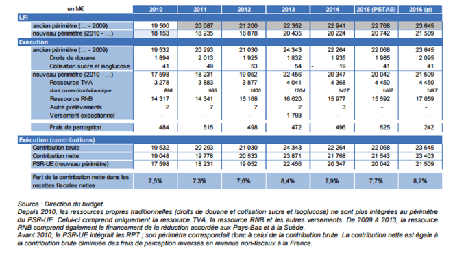 (1) Le document budgétaire : http://www.performance-publique.budget.gouv.fr/sites/performance_publique/files/farandole/ressources/2016/pap/pdf/jaunes/jaune2016_relations_financieres_UE.pdf