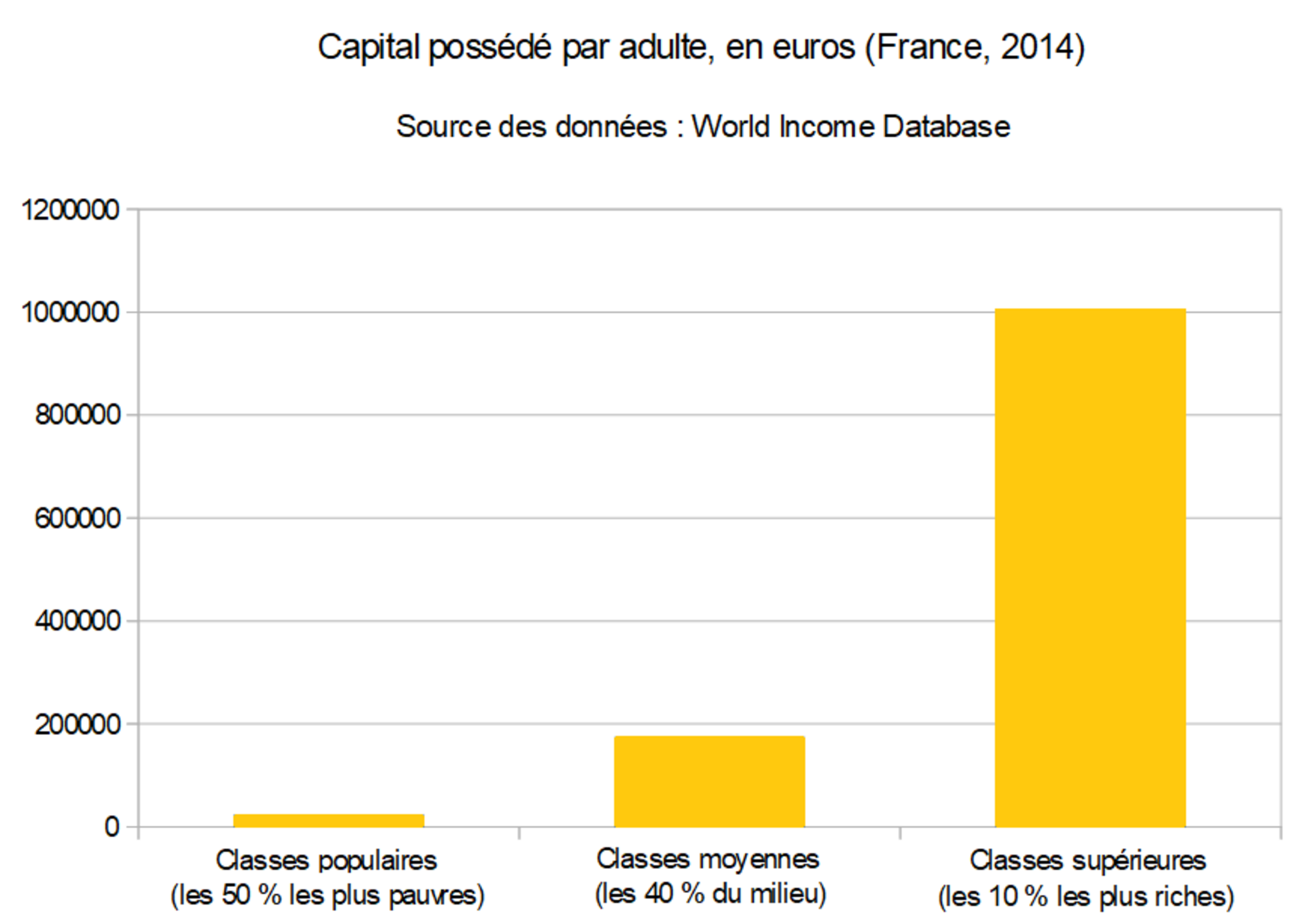 En effet le revenu correspond à un flux de richesse, tandis que le patrimoine est un stock constitué de tout ce qui peut être possédé dans une économie capitaliste : appartements, parts d'entreprises, objets précieux, actions en bourse, liquidités déposées sur des comptes bancaires, terrains, etc. Le patrimoine a ceci de particulier qu'il est généralement distribué de manière extrêmement inégalitaire, dans tous les pays et à toutes les époques. Le graphique suivant donne un aperçu de la situation dans la France d'aujourd'hui.