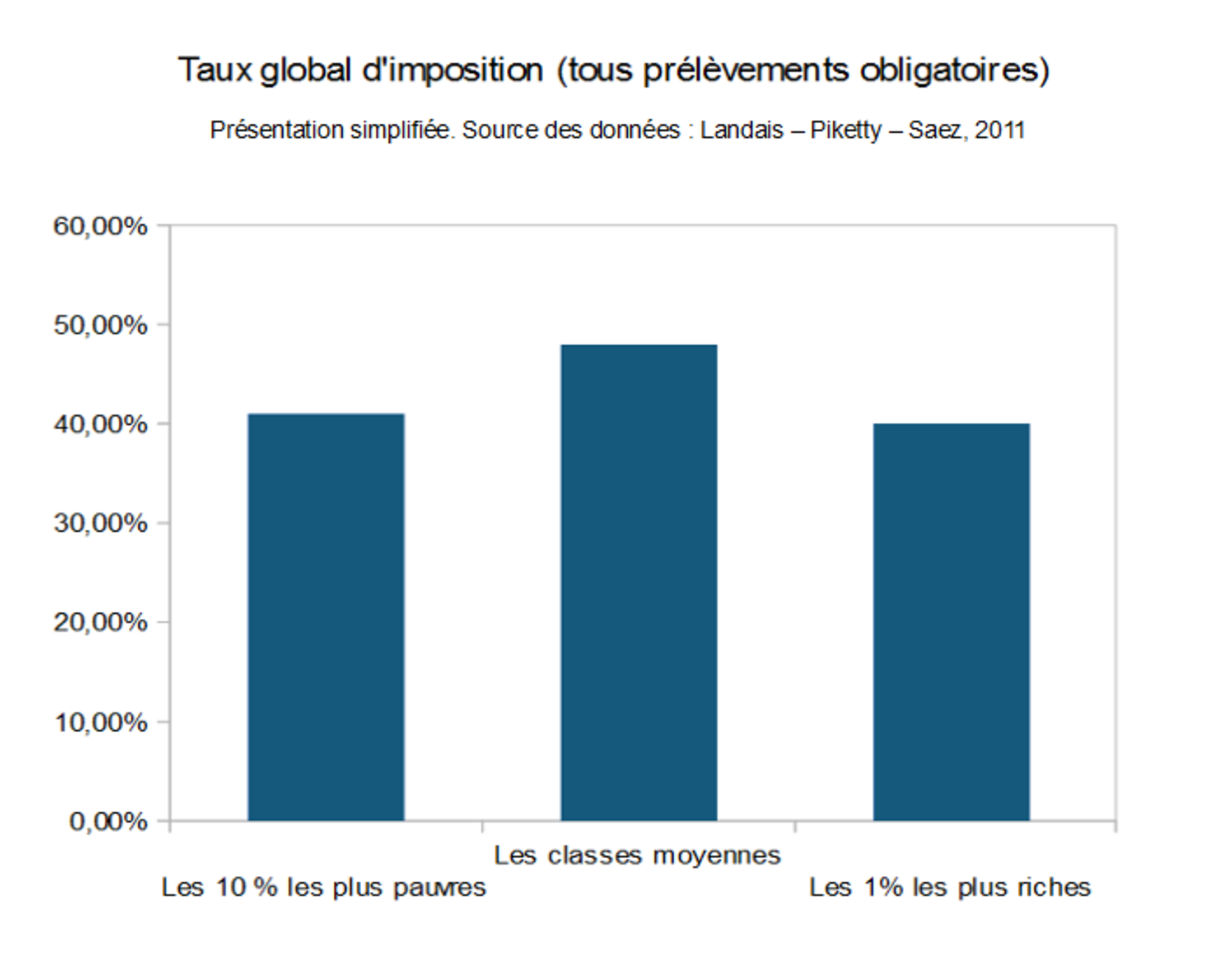 On pourrait penser que les impôts interviennent pour corriger le tir, et soumettent les plus riches à de si lourds prélèvements que cela permet de compenser la tendance spontanée du capitalisme à l'accroissement des inégalités. En théorie, une telle intervention est possible – tout dépend du niveau auquel sont fixés les impôts et de la manière dont ils sont calculés. En pratique, pourtant, on constate que la fiscalité française actuelle ne permet pas de réduire les inégalités. Pour comprendre cet état de fait, il faut considérer l'ensemble des prélèvements obligatoires auxquels chaque habitant de notre pays est soumis : cotisations sociales, impôts sur le revenu (IRPP [8] et CSG), taxes sur la consommation (TVA, TIPP, etc.) et impôts sur le capital (Impôt de Solidarité sur la Fortune, Taxe Foncière, Impôt sur les Sociétés). Lorsqu'on prend en compte tout cela, on peut calculer le taux global d'imposition qui s'applique à chaque classe sociale.