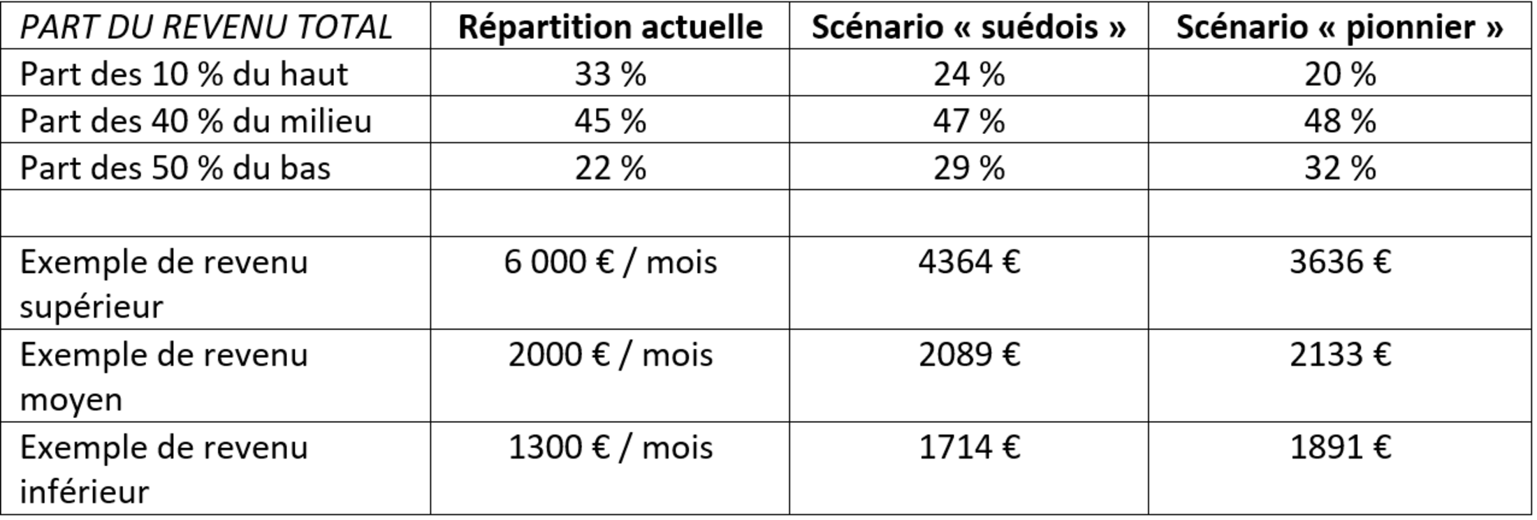 [9] A noter qu’il s’agit juste de donner un aperçu des effets de la réforme que je propose. Dans le tableau, j’indique le revenu disponible (revenus du travail et du capital – impôts directs) d’un individu, que j’élève ou que j’abaisse selon le scénario de redistribution retenu.