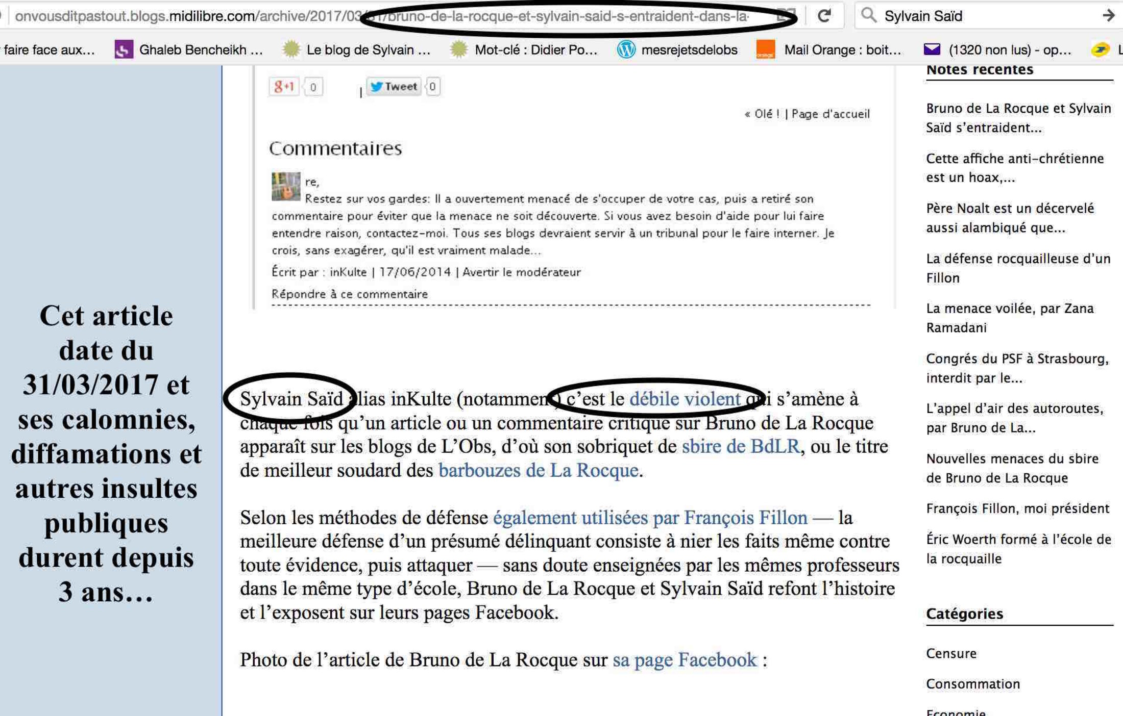 Voici une capture d'une de ses nombreuses insultes (moi, je ne l'insulte jamais mais révèle l'ignominie d'un blogueur sans le nommer ni taguer mes notes avec son identité):