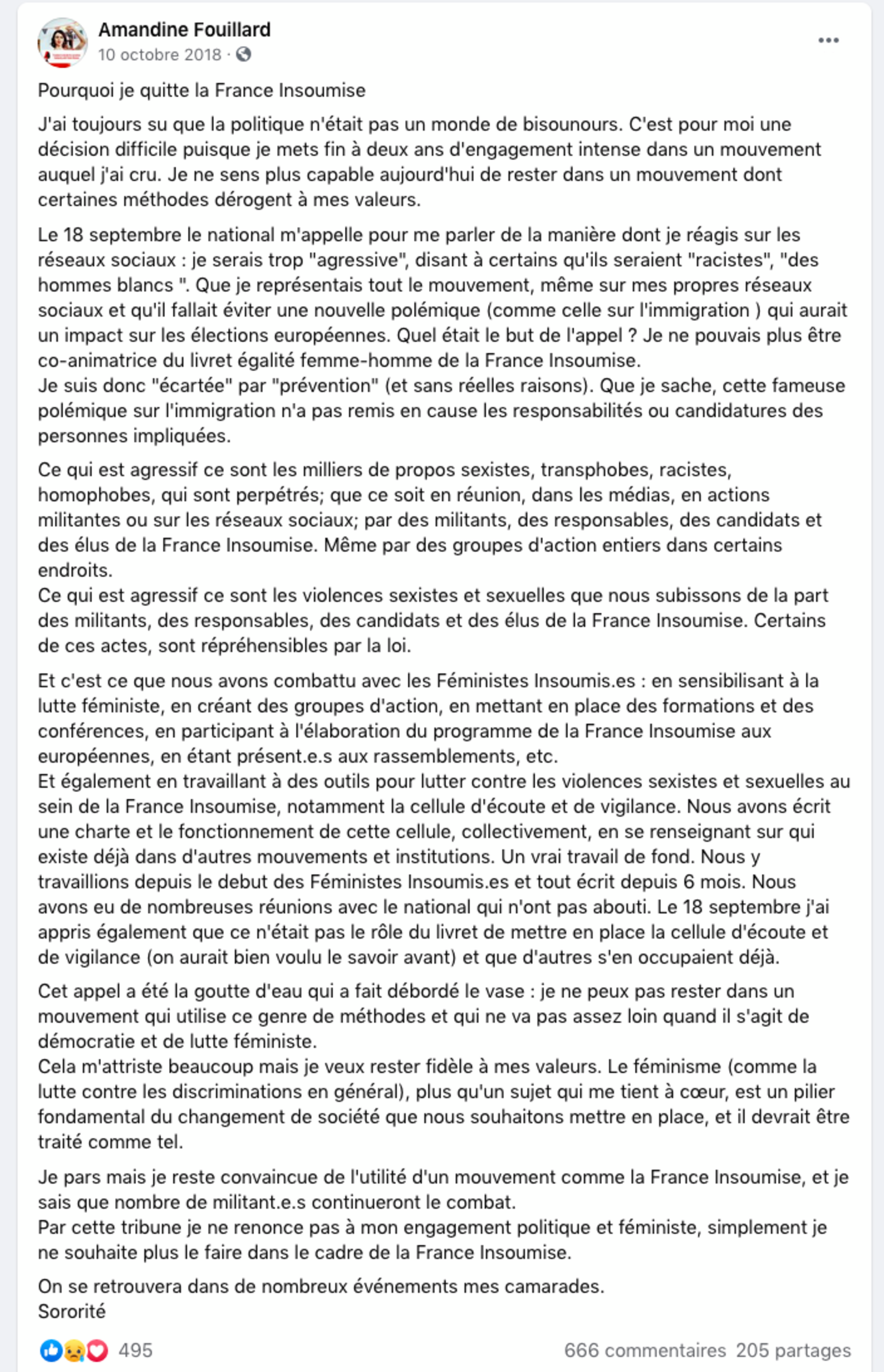 Amandine Fouillard, ancienne responsable du livret « égalités femmes-hommes » du programme, annonce sur Facebook qu'elle quitte le mouvement. Elle explique avoir été démise de ses responsabilités d'un simple coup de fil, sans motif consistant, et dénonce la prolifération des propos sexistes, racistes, homophobes, transphobes, au sein du mouvement. Elle dénonce également « les violences sexistes et sexuelles que nous subissons de la part des militants, des responsables, des candidats et des élus de La France Insoumise ». Et de préciser: « Certains de ces actes sont répréhensibles par la loi. » Elle s'indigne en outre que son projet de créer une cellule d'écoute et de vigilance contre les violences sexistes et sexuelles lui ait été retiré pour être confié à d'autres personnes.