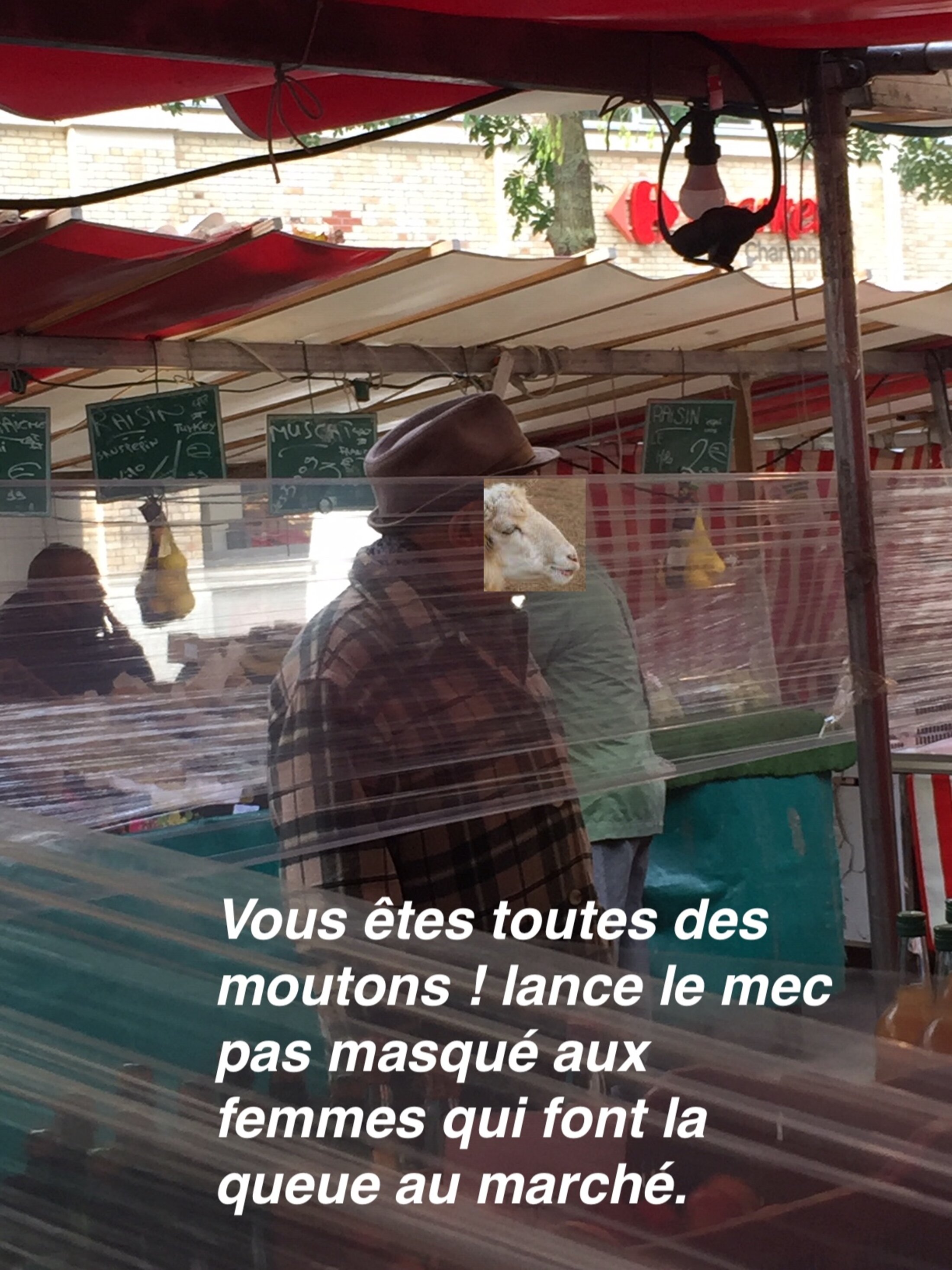 Vous êtes toutes des moutons ! lance le mec pas masqué aux femmes qui font la queue au marché.
