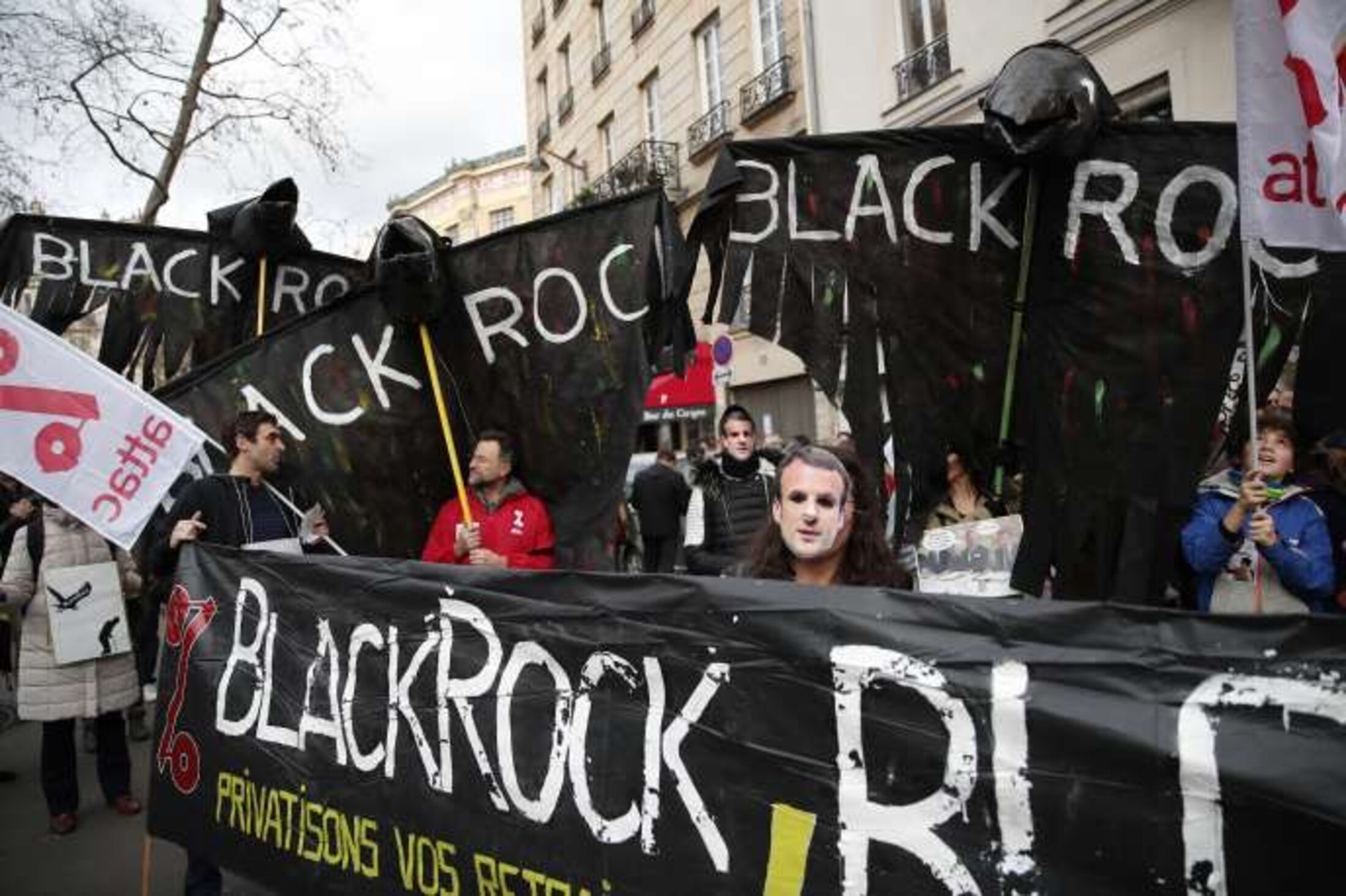 (Black Rock est le plus gros fonds de gestion d'actifs au monde et détient environ 7000 milliards d'euros de placement, soit près de trois fois le PIB français. Le fond tire la majorité de ses revenus en gérant l'épargne retraite privée de salariés du monde entier. Sa spécialité consiste à transformer l'épargne retraite aux quatre coins du monde en les négociant en Bourse et en les plaçant sur les marchés financiers, à la nanoseconde près, à l'aide de son système Aladin.)
