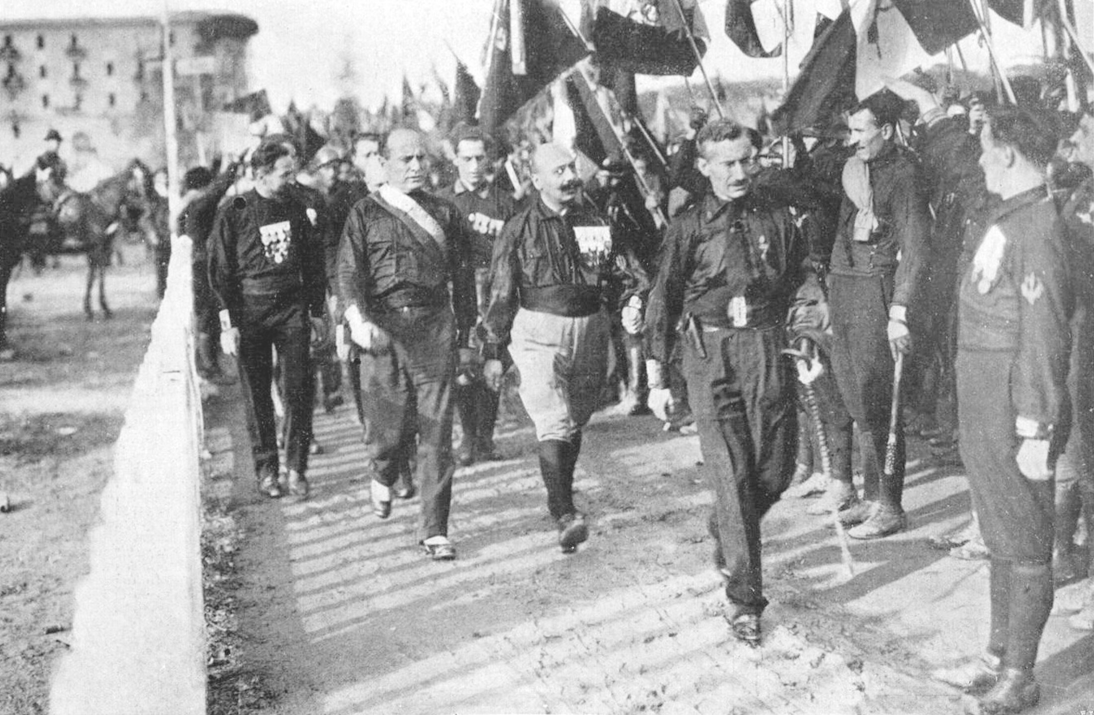 Menée par les faisceaux italiens et les Chemises Noires de Mussolini, la Marche paramilitaire d'Octobre 1922 faisait pression sur le gouvernement libéral et la classe politique, ralliant autour d'elle les mouvements d'anciens combattants, résidus des vaincus de 1914-18.