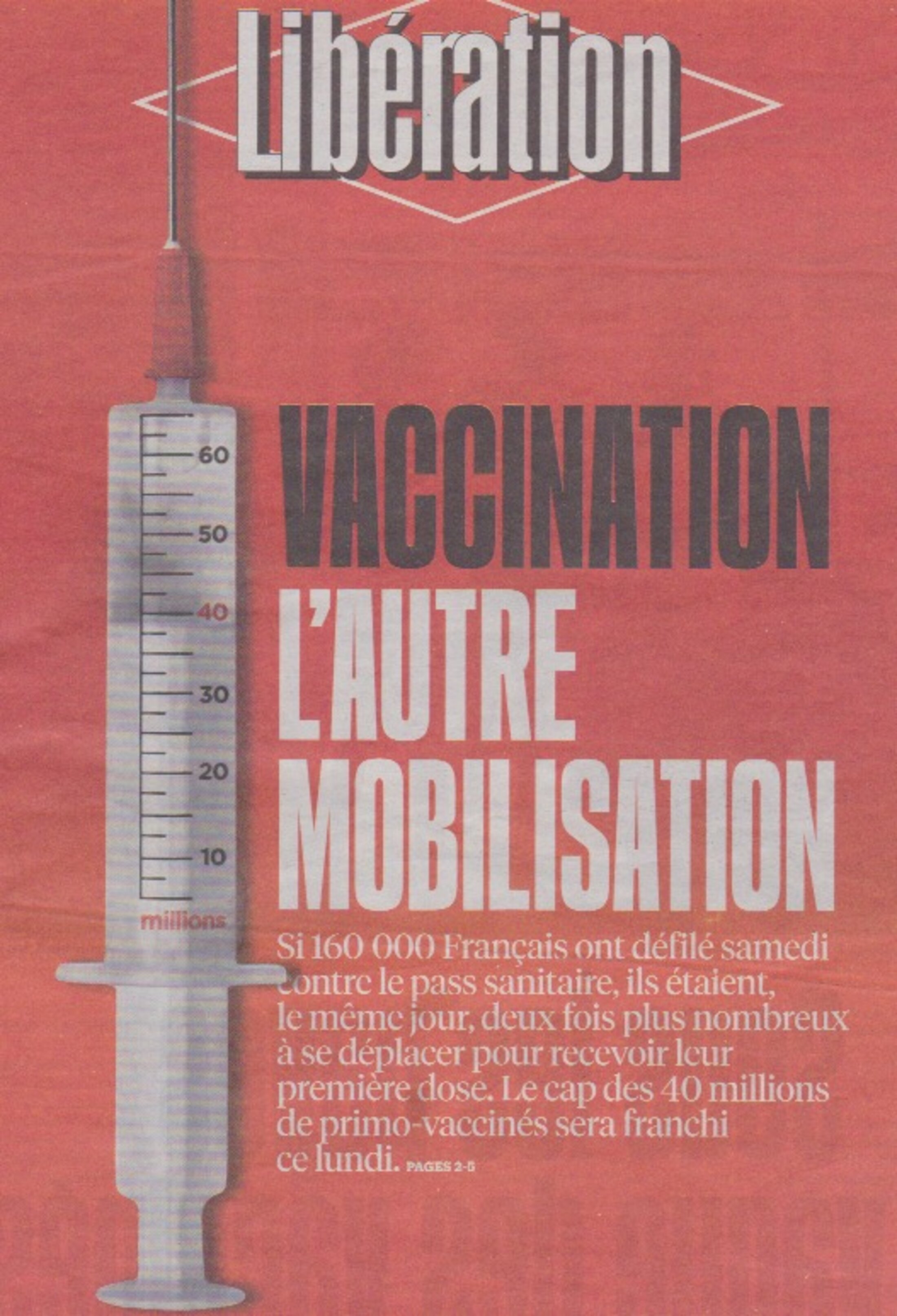 Nicolas, l'interrogeons-nous, si la mobilisation aujourd'hui en France, contre le pass sanitaire se poursuit avec plus de 160 000 manifestants ces derniers jours, l'élan en faveur de la vaccination ne faiblit pas pour autant. 160000 Français dans les rues contre le pass sanitaire, ils étaient deux fois plus nombreux à se déplacer pour recevoir leur première dose vaccinale le même jour. Quant au nombre de personnes ayant reçu la première injection, il devrait dépasser ce lundi le cap des 40 millions.