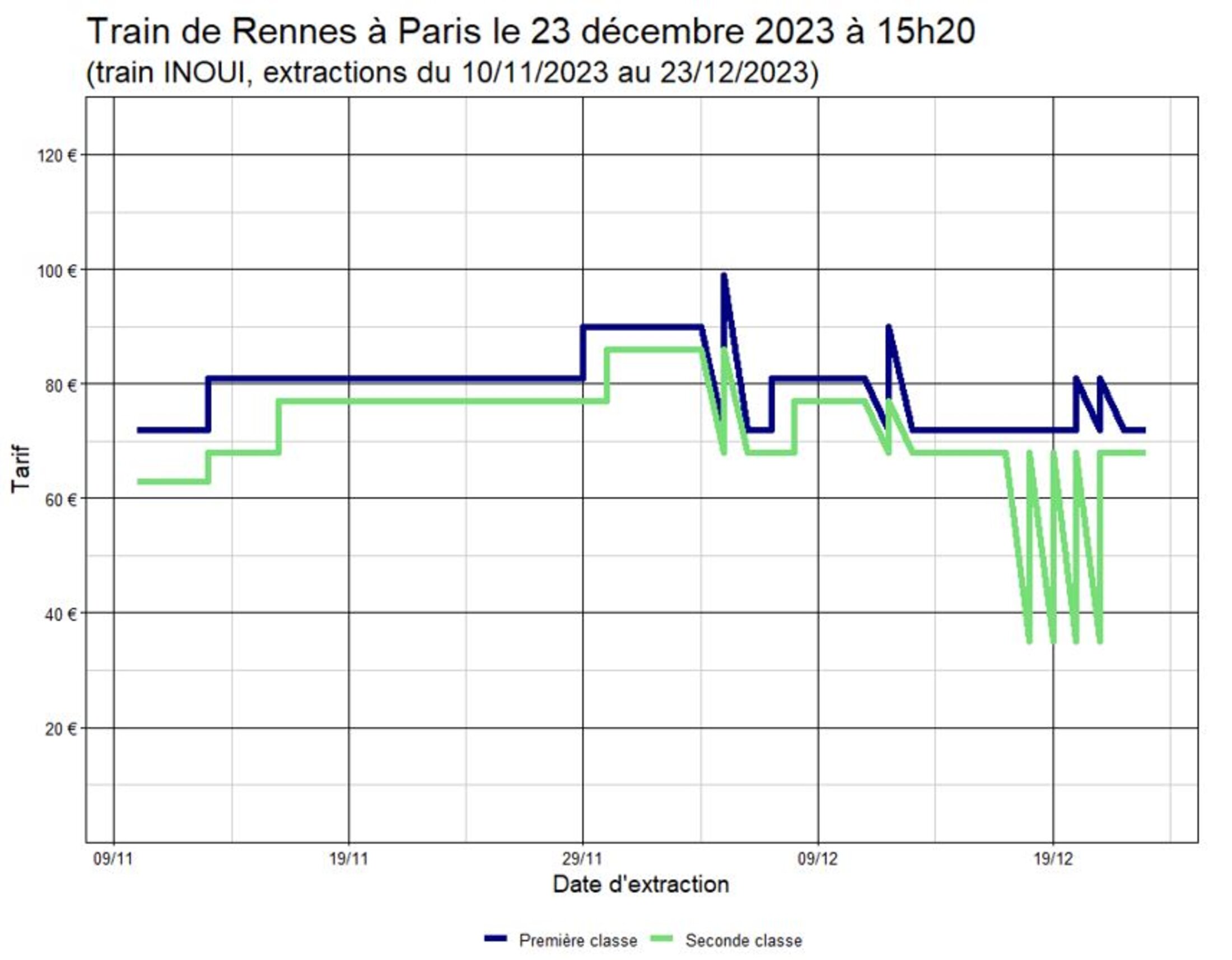 Le phénomène des baisses de tarifs présente une dynamique complexe, avec des réductions tarifaires qui varient en nature et en durée. Certaines de ces baisses semblent être temporaires, probablement dues à des annulations de billets, tandis que d'autres sont plus prolongées et progressives, comme celle du Paris -> Lyon illustré ci-dessus. Voici un autre exemple : le train INOUI de Rennes à Paris du 23 décembre à 15h20 a connu à la fois des baisses temporaires et des baisses plus pérennes de tarifs, tant en première qu'en deuxième classe. Le billet en seconde classe est passé de 63€ à 86€ entre octobre et fin novembre. On constate ensuite une baisse progressive jusqu'à 68€ après le 5 décembre, avec même des pics à 35€ entre le 18 et le 20 décembre. Les billets en première classe suivent relativement le même pattern.