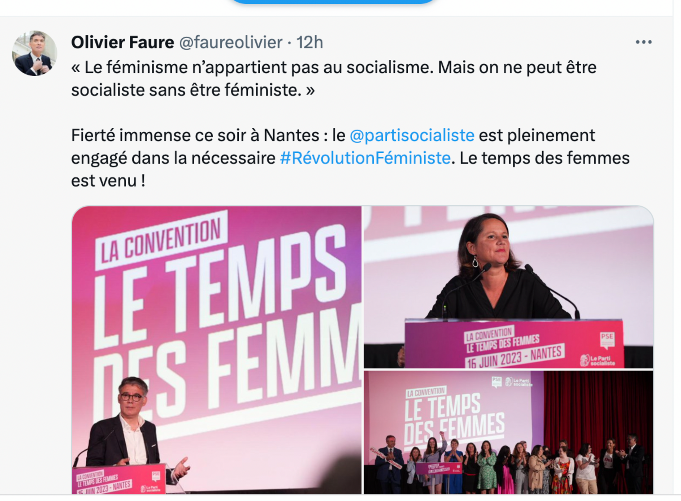 Au moment où le Premier Secrétaire du Parti Socialiste monte sur la scène de l'atelier de la Convention "Le temps des femmes", une salve d'applaudissements retentit dans une salle Mauduit où son discours sur les femmes trouve écho parmi les militants. « Si notre situation en France n'est pas dramatique », déclare-t-il avec conviction, « puisque 53 % des femmes françaises de moins de trente-cinq ans sont diplômées de l'enseignement supérieur, elle demeure inacceptable. Comment un pays comme le nôtre, qui se targue d'être le champion de l'égalité, qui donne des leçons au reste du monde, peut-il tolérer les inégalités salariales et la précarité dont sont victimes les femmes travaillant à temps partiel ? » Puis, le député du Val-de-Marne entame une analyse du livre très critique du Suicide français, un essai d'Éric Zemmour. Paru en 2014, ce livre vendu à plus de 500 000 exemplaires évoque l'essor de phénomènes autrefois marginaux ou confinés à la sphère privée (libération sexuelle, problèmes de couple, etc.). Olivier Faure entame une longue tirade contre l'ancien polémiste d'extrême droite. Il clame que ses propos à l'égard du chanteur Daniel Balavoine expliquant que son fils serait « le fruit de ses entrailles » sont sexistes. Ainsi, le président du parti Reconquête exprimerait sa nostalgie d'une époque où des hommes forts comme Napoléon ou Charles De Gaulle pouvaient imposer la domination de la France en Europe (page 22 du "Suicide Français").