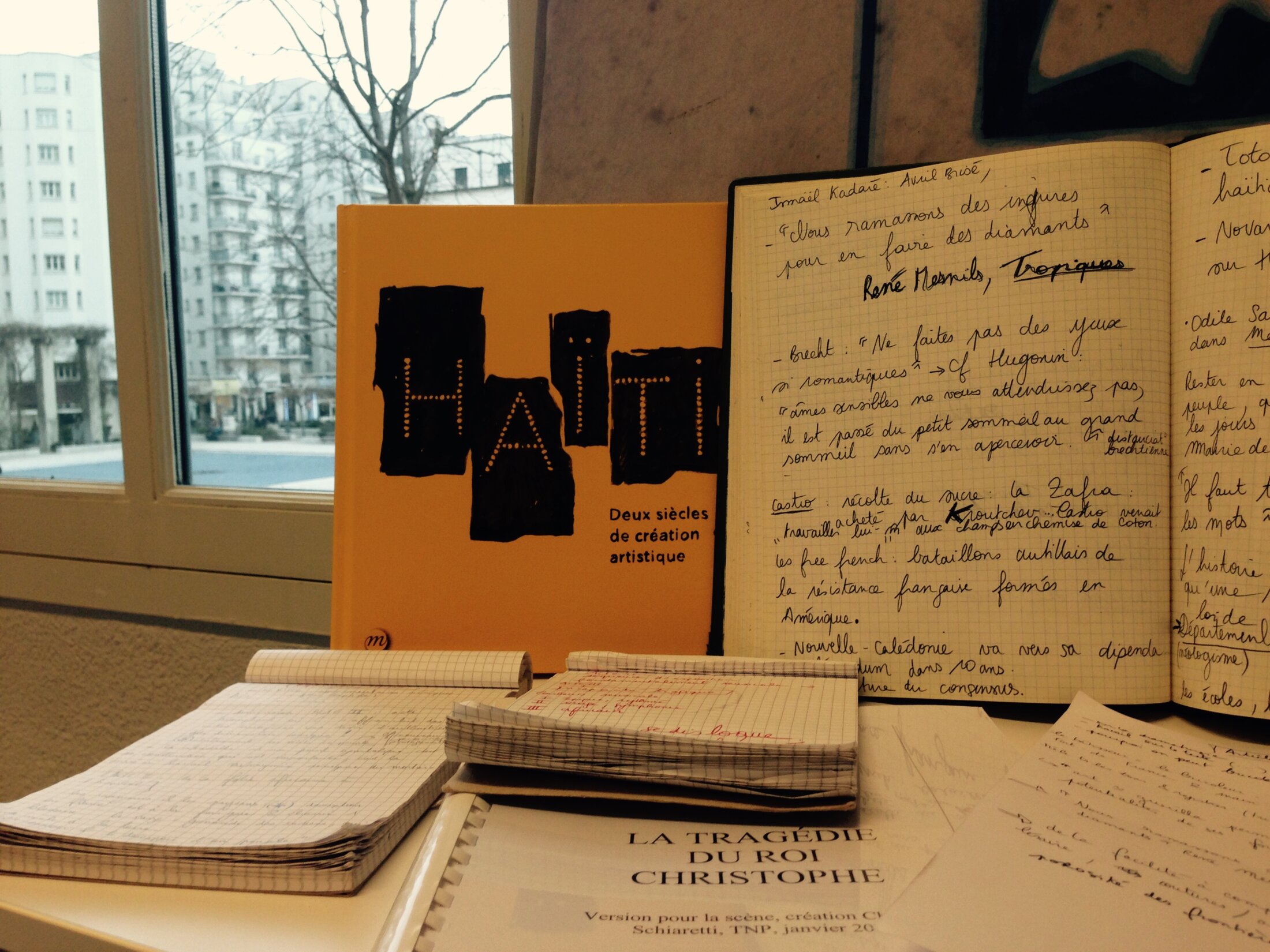 En fouillant dans cette grande machine-littérature qu'est l'œuvre de Aimé Césaire, nous avons, sans mauvais jeu de mot, mis les mains dans le cambouis. C'est là un des rôles du dramaturge dans le processus de création d'un spectacle : farfouiller et éplucher une œuvre, détricoter un texte, l'ajuster, l'étoffer d'autres pépites littéraires que nous offre un auteur, si la mise en scène en ressent le besoin. Pour la création de La Tragédie du roi Christophe, nous sommes allés piocher dans toute l'œuvre de Césaire, si dense, et en même temps si cohérente, afin de procéder à un léger travail de montage. Il s'agissait d'abord, dans un souci d'équité distributionnelle, d'ajouter du texte pour des personnages secondaires qui, perdus dans la nébuleuse gravitant autour du roi Christophe, nous paraissaient trop absents. La pièce, foncièrement déséquilibrée dans sa distribution originelle, gagnait à développer certains rôles. Nous avons donc enrichi les personnages du peuple, trop importants pour être laissés de côté, afin de redistribuer la parole mais de lui donner aussi une nouvelle vivacité, ainsi qu'une forme de choralité. Dans La Tragédie du roi Christophe, le peuple contrebalance la toute-puissance despotique de Christophe, et donne à entendre un autre langage, celui que Césaire à découvert lors de son voyage à Haïti en 1944 : un parler créole, fait d'expressions idiomatiques et d'une syntaxe aussi drôles que déroutantes. À ce peuple caractérisé par un langage populaire foncièrement prosaïque, nous avons ajouté la possibilité du poétique, en puisant dans divers poèmes de Aimé Césaire, tirés de ses recueils de poésie Ferrements (1960), Les Armes miraculeuses (1946), mais aussi dans Moi, laminaire (1982), Cahier d'un retour au pays natal (1939), et Comme un malentendu de salut (1994).