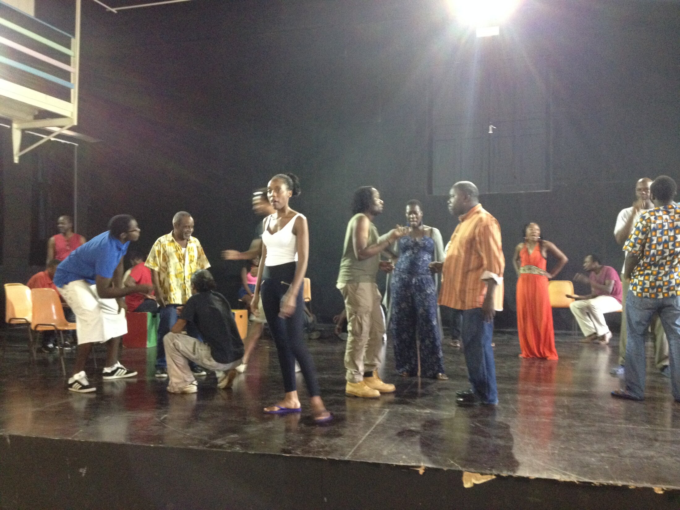 Ponctuellement, il a été nécessaire de répondre à des besoins dramaturgiques : retrouver une référence, sa source, ou apporter aux comédiens divers matériaux qui puissent nourrir leurs interprétations - une captation de 1789 d’Ariane Mnouchkine ; le texte de Lorenzaccio, de Musset ; une généalogie des dieux loa, du vaudou, pour appréhender les diverses références disséminées dans la pièce… L’assistant peut également être amené à participer à des missions de Relations avec le public en dehors des temps de répétition. Ce fut le cas, lors de séances en amont du spectacle, à destination d’un conseil de quartier de Vaulx-en-Velin, petit groupe d’abonnés au TNP ; ou à destination de publics scolaires : l’assistant peut alors faire part de sa propre expérience, du déroulement de la création, et en expliciter les enjeux.