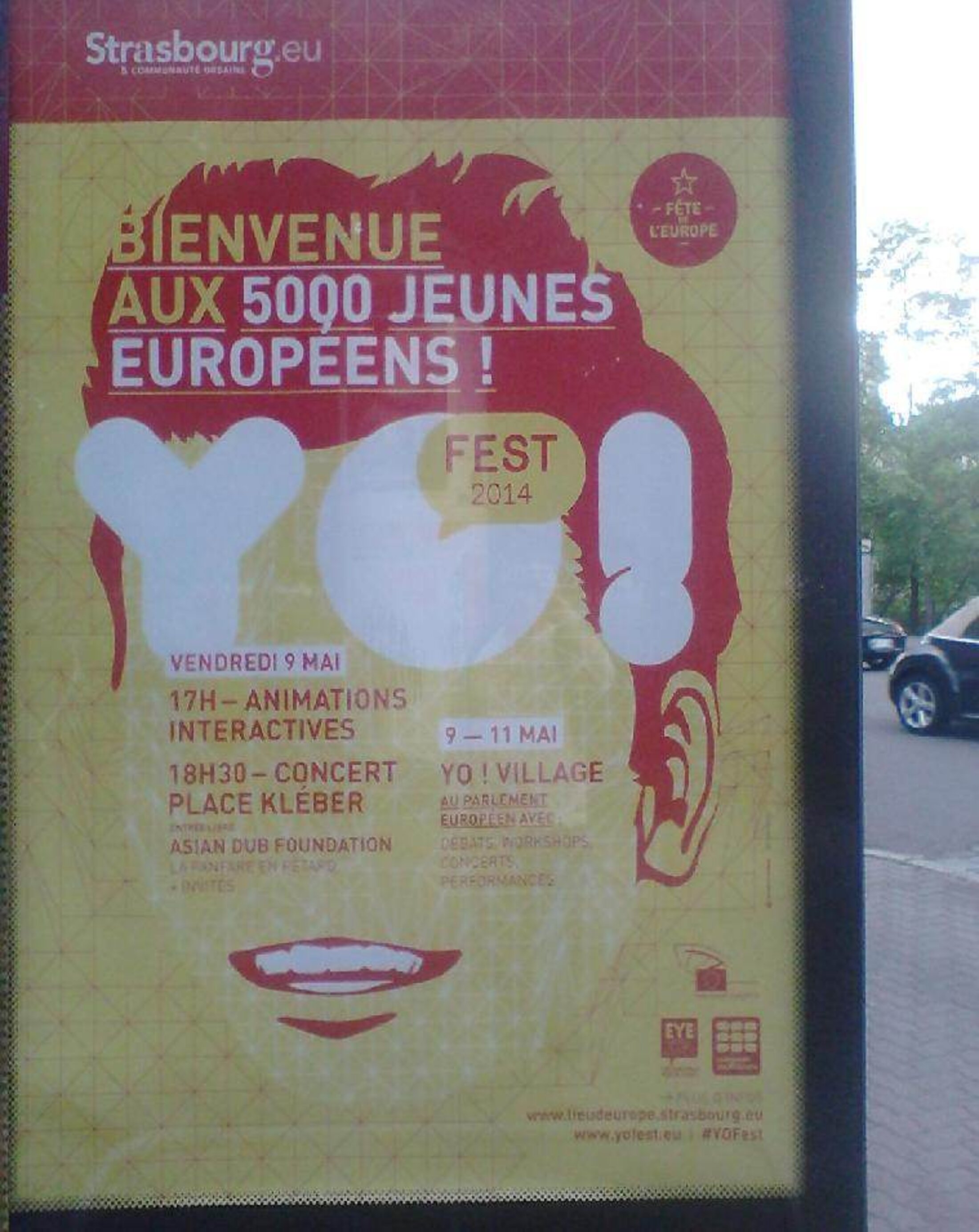 Vous pouvez remarquer que l’heure de la soirée ne permet pas de comprendre que c’est réellement un concert qui finira vers minuit, et que ce que la ville a grandement mis en avant c’est l’accueil des 5000 jeunes. Toujours d’après ce même monsieur, la ville a fait cela pour que les personnes voient ce qu’elle (la ville) fait, sans pour autant les faire participer. C’est bien pour cela, qu’à part en nous arrêtant pour la lire, ce qui est souvent impossible comme elles sont placées devant le tram et les routes, nous ne lisons que « Bienvenue aux 5000 jeunes Européens ». La ville a donc fait un travail sur son image, du marketing en quelque sorte.