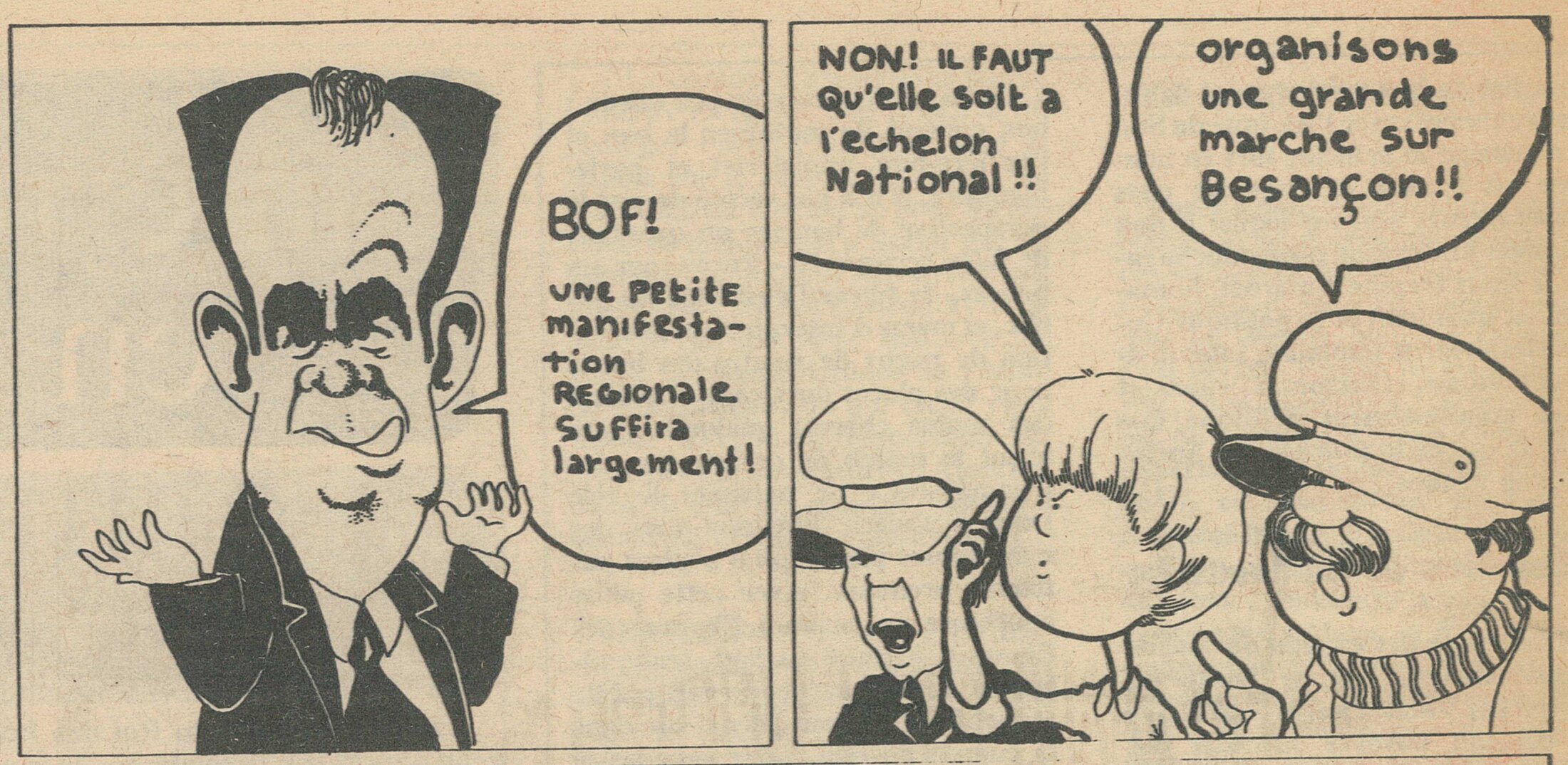 Avec les Lip en tête, suivi·es des directions syndicales, la marche réunira des dizaines de milliers de syndicalistes venu·es de nombreux départements, pas seulement limitrophes. La présence de l’extrême gauche détonne : parmi les « 100 000 de Besançon », elle rassemble près d’un tiers du cortège toutes obédiences confondues.