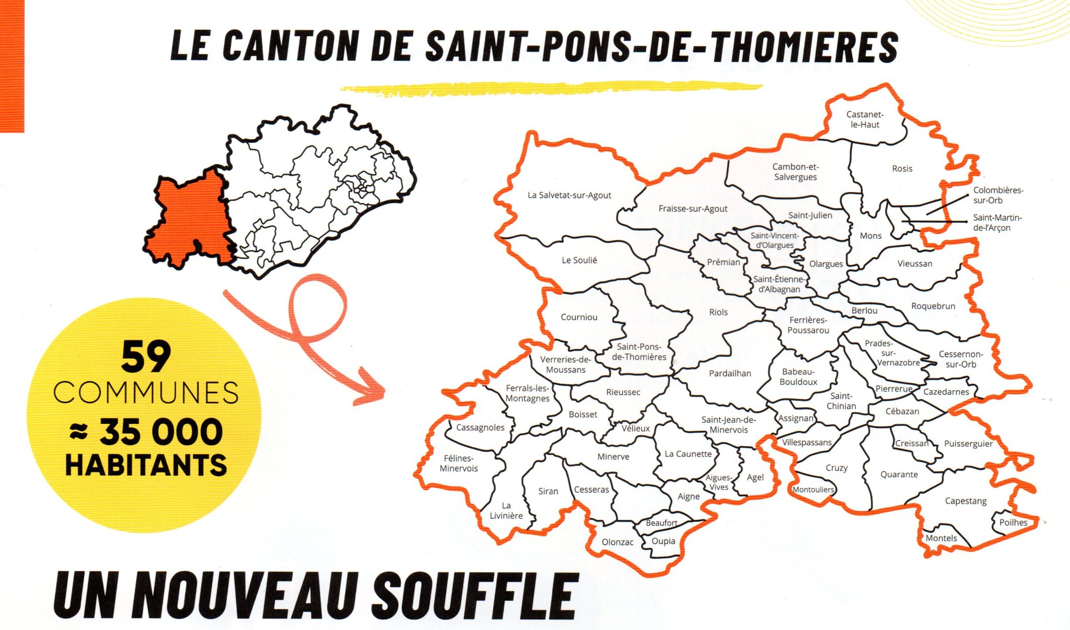 Le canton de Saint-Pons de Thomières, vaste territoire de l’ouest héraultais, regroupe sur 59 communes rurales, de Capestang (dont le maire est Pierre Polard) à la Salvetat sur Agout, d’Olonzac à Roquebrun, 35000 habitants.