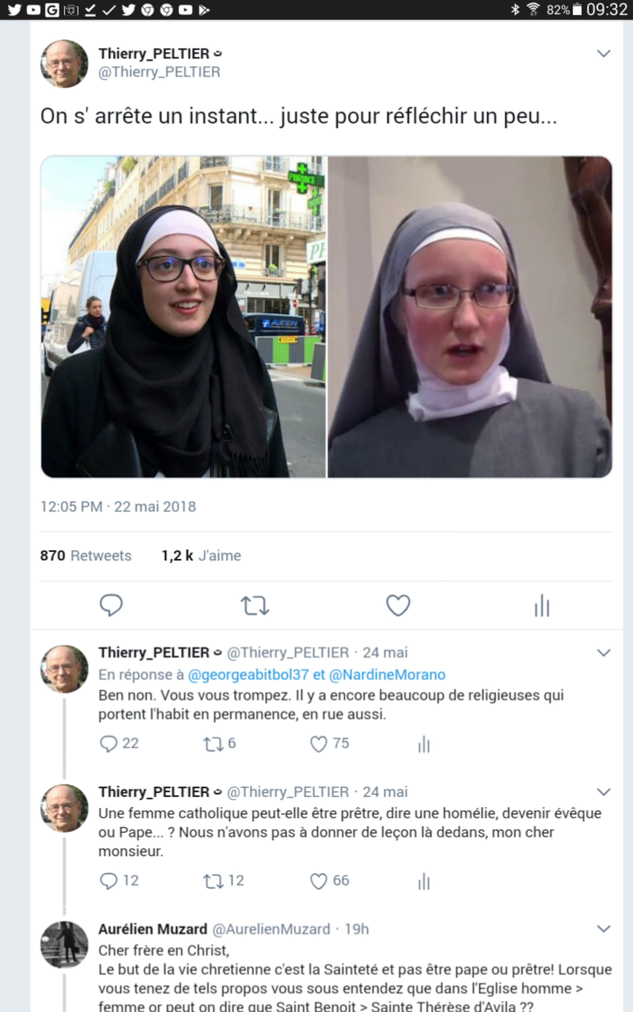 Le voilà, ce fameux tweet. Deux femmes, deux voiles, deux sourires... La première est Maryam Pougetoux, musulmane et représentante de l'UNEF, Syndicat étudiant. L'autre est une religieuse catholique des Soeurs Apostoliques de St Jean, une congrégation nouvelle née dans les années 70.