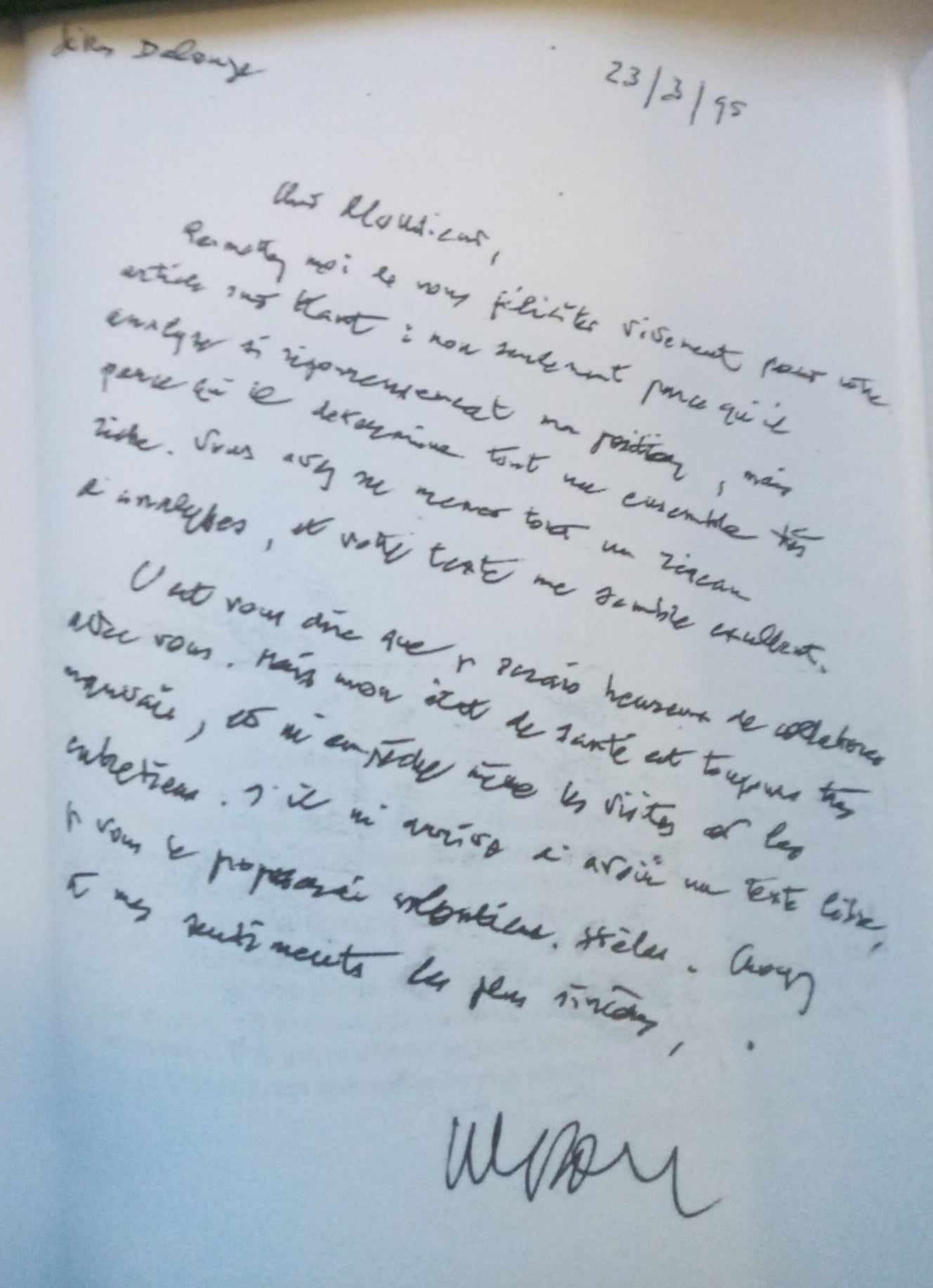 Cher Monsieur, Permettez-moi de vous féliciter vivement pour votre article sur Kant : non seulement parce qu'il analyse si rigoureusement ma position, mais parce qu'il détermine tout un ensemble très riche. Vous avez su mener tout un réseau d'analyses, et votre texte me semble excellent. C'est vous dire que je serais heureux de collaborer avec vous. Mais mon état de santé est toujours très mauvais. S'il m'arrive d'avoir un texte libre, je vous le proposerais volontiers. Hélas. Croyez à mes sentiments les plus sincères.