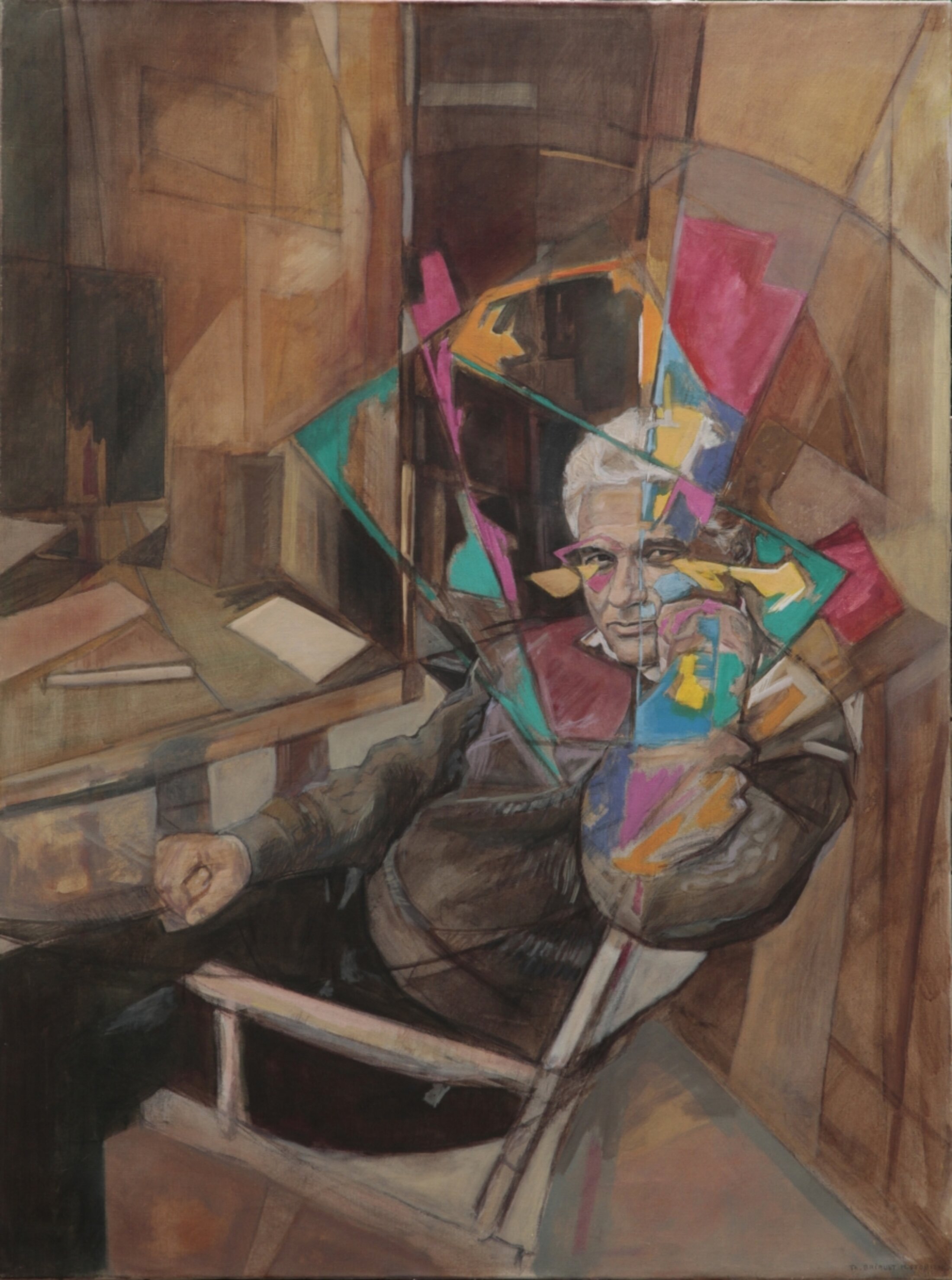 « En général, je dois le dire aussi, certains d’entre vous parmi mes amis, mes proches qui sont ici le savent bien, j’ai un très mauvais rapport à mon image. Je ne supporte pas mon image. Je ne supporte pas les photographies, je ne supporte pas la télévision, mais l’horreur que m’inspire mon image surtout dans une image parlante quand il m’arrive parce que ça m’arrive au hasard, comme ça, de me laisser filmer en train de faire une conférence et qu’on le passe en vidéo, c’est la torture absolue. […] Eh bien la chance que j’ai avec ces 14 ou 18, on ne le saura jamais, ces 16 portraits, c’est que ça me libère de cette gêne, de ce gène, de ces gênes, et donc je le dis en toute simplicité narcissique, je n’éprouve aucune gêne devant ces tableaux. Donc vous m’avez transfiguré.»