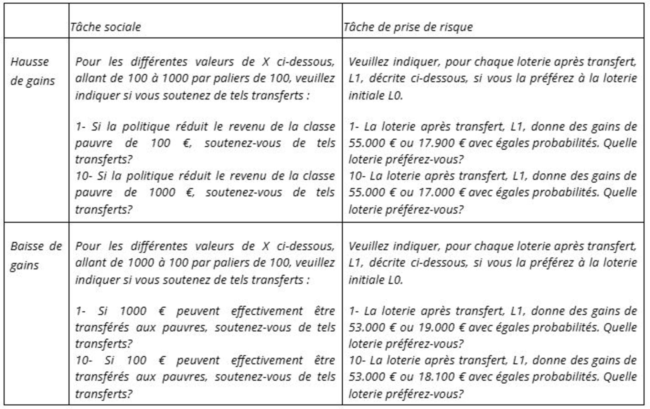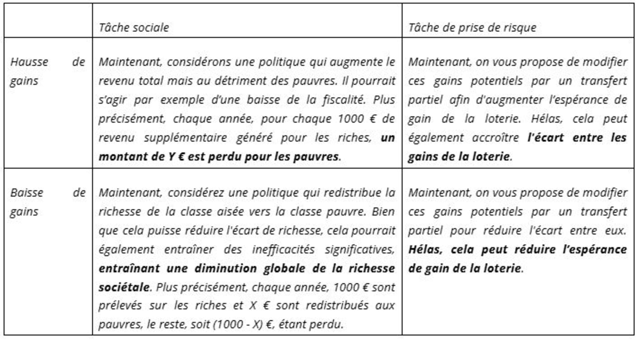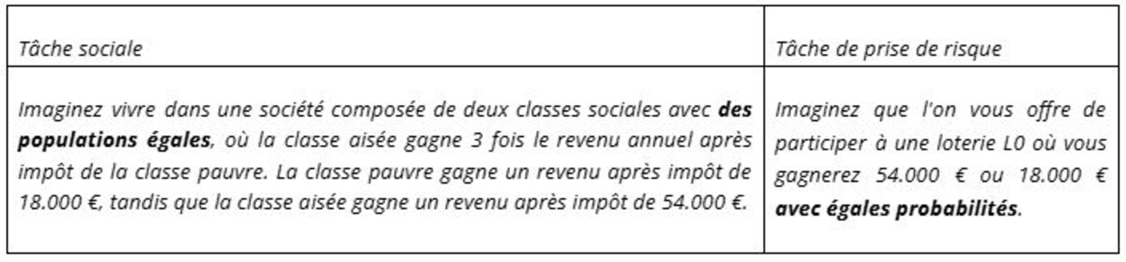Les tâches sociales et les tâches de prise de risque du questionnaire partagent la même mise en situation, structurée pour permettre une comparaison entre classes sociales et loteries.