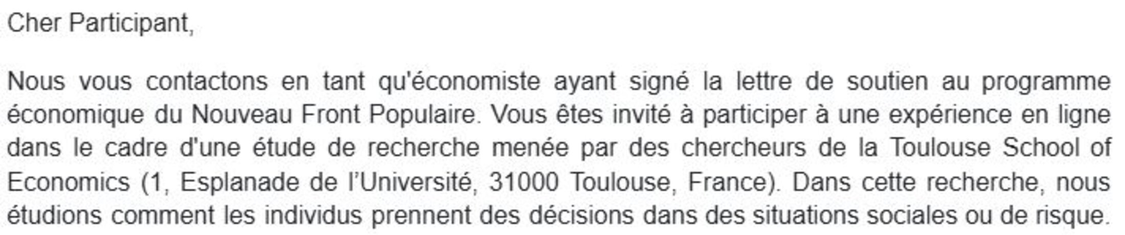 Ce questionnaire a été conçu et diffusé par une équipe de la Toulouse School of Economics (TSE). Il est important de noter que cette équipe n’a aucun lien avec le site web qui a accueilli la lettre de soutien des signataires ni avec le Nouveau Front Populaire (NFP) lui-même. Leur initiative semble donc totalement indépendante de l’organisation politique ou des promoteurs de cette lettre.