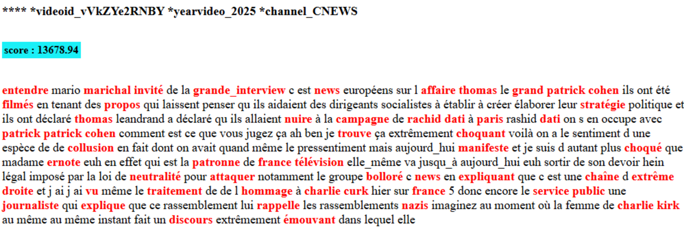 LCI, France Info et BFMTV diffusent des vidéos YouTube quotidiennement et ont des playlists exploitables, ce qui n'est pas le cas de CNEWS. En effet, la chaîne YouTube CNEWS n'a que très peu de vidéos disponibles, et toutes font moins de quelques minutes. Il s'agit de capsules vidéos de certains extraits de leurs émissions, mais jamais les émissions complètes. Par contre, la chaîne YouTube d'Europe 1, désormais régulièrement en duplex avec la chaîne CNEWS, contient de nombreuses émissions qui concernent CNEWS. J'inclus donc les vidéos issues d'Europe 1 comme étant des vidéos de CNEWS. Au final, je me limite aux vidéos publiées en 2024 et 2025 durant plus de plus de 2 minutes, afin d'éviter les capsules prévues spécifiquement pour les réseaux sociaux.