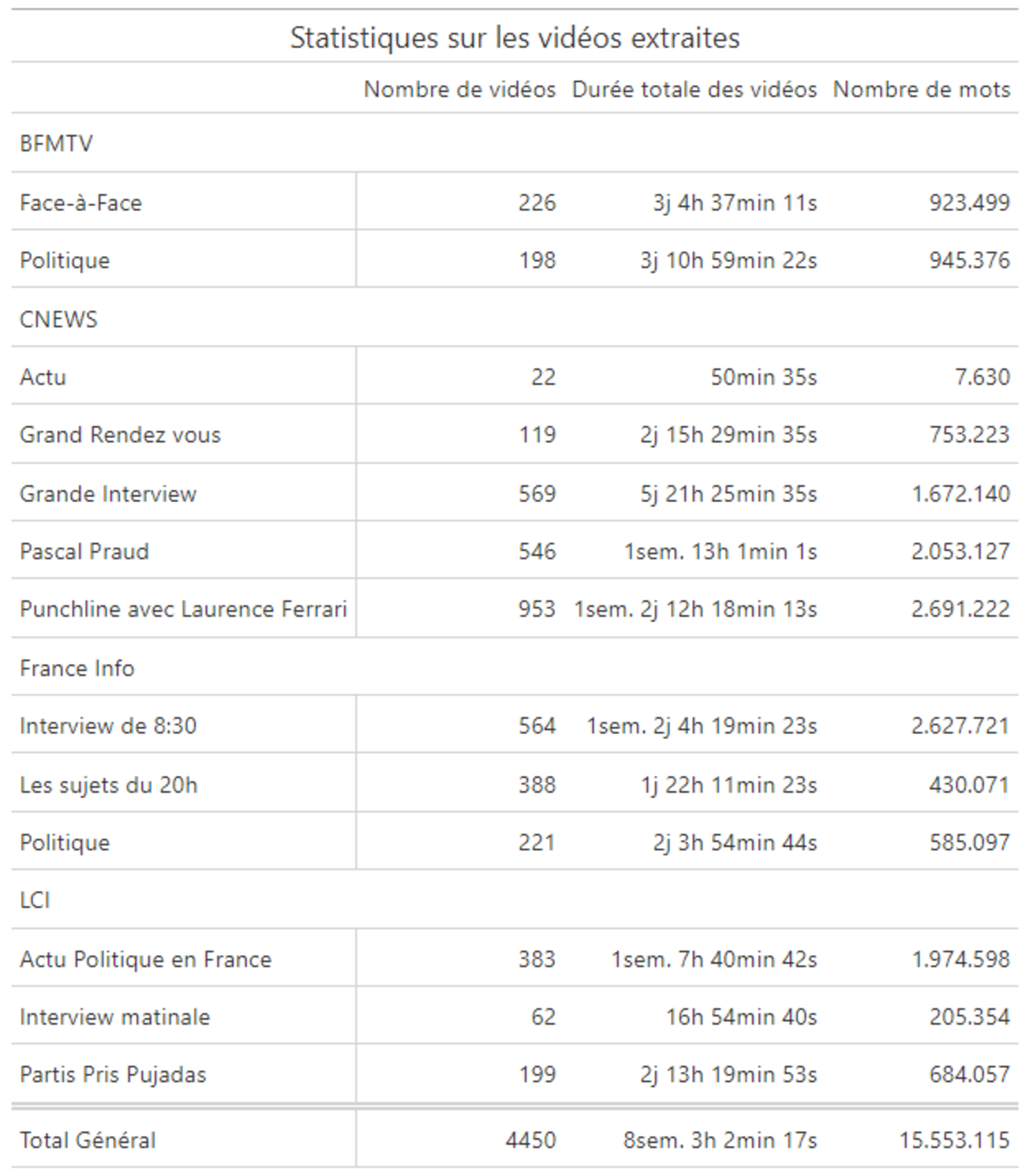 J'ai extrait les textes de 4450 vidéos, pour constituer un corpus de 15 millions de mots et une durée totale de visionnage de 8,5 semaines, avec une forte diversité selon les chaînes d'information : 6 jours pour BFMTV, 3 semaines pour CNEWS, 2 semaines pour France Info et 1,5 semaine pour LCI. BFMTV a peu de contenu car la chaîne ne propose de remonter que jusqu'à août 2024. En se limitant à 2025, on retrouve des chiffres comparables à LCI et France Info. CNEWS diffuse très largement ses contenus, même en me limitant à quatre playlists (Grand Rendez-vous, Grande Interview, Pascal Praud et Punchline avec Laurence Ferrari).