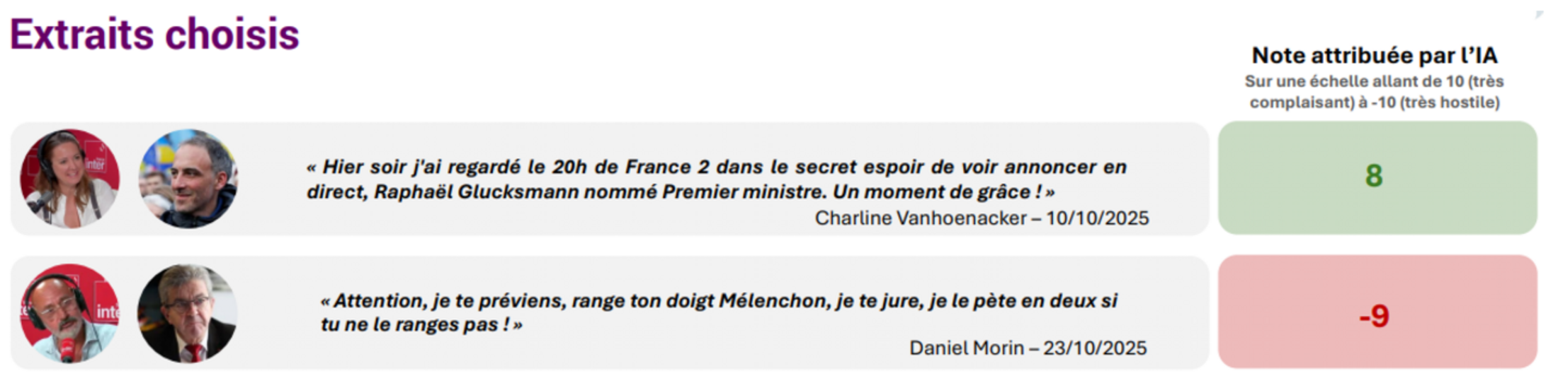 De plus, l'IA s'est révélée incapable de saisir l'ironie et le second degré, pourtant centraux dans les chroniques humoristiques de France Inter. Leur notice méthodologique donne une illustration de ceci avec des citations satiriques de Charline Vanhoenacker ou Daniel Morin. Celles-ci ont été prises au premier degré par l'algorithme, faussant les scores de bienveillance ou d'hostilité envers les personnalités politiques.