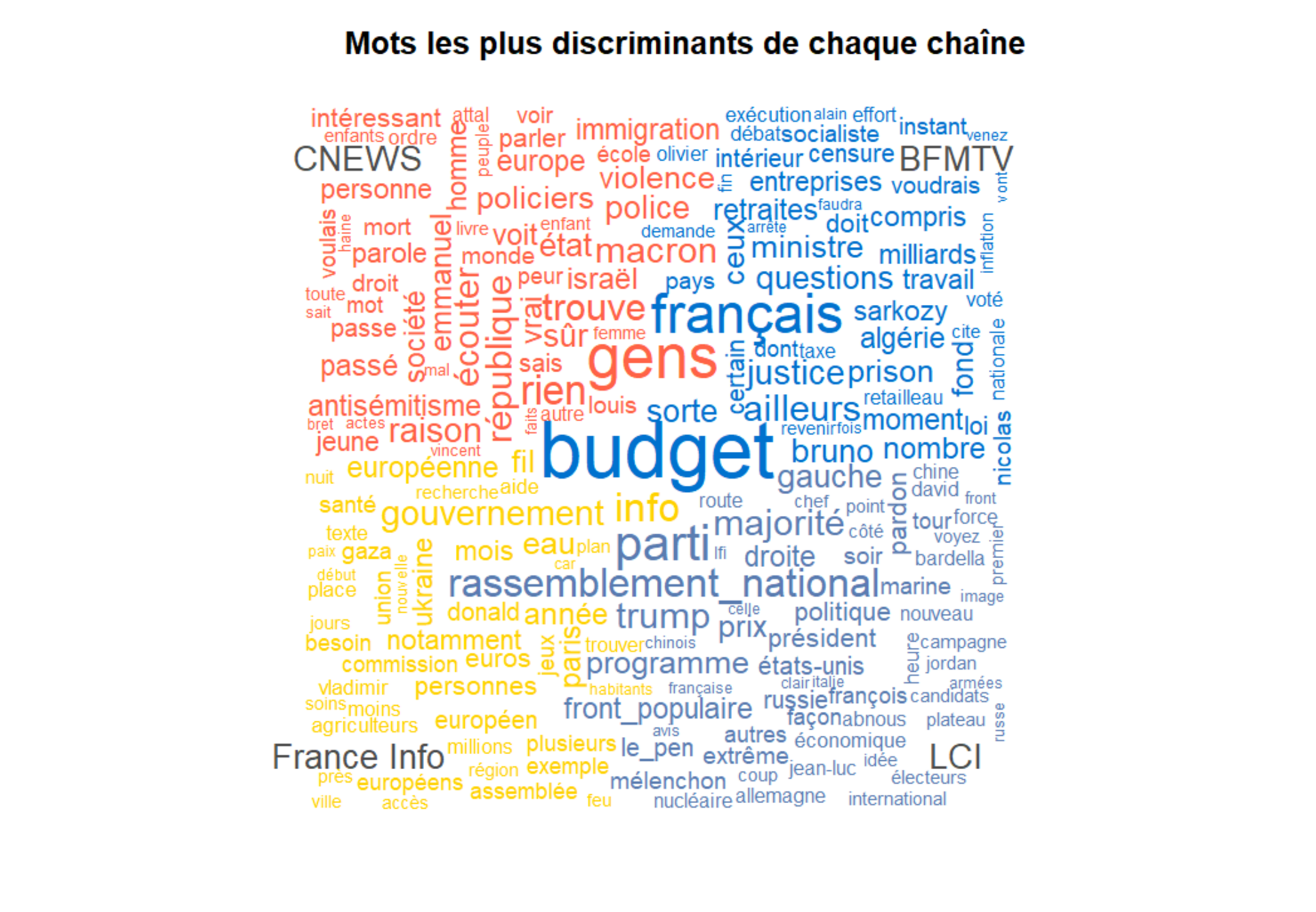En observant les mots les plus utilisés par chaque chaîne d'information, on remarque que les mêmes mots reviennent toujours : Français, politique, pays, fois, gouvernement. Ces mots sont communs et ils ne servent pas à comprendre les sujets de chaque chaîne. Par contre, en calculant les mots les plus discriminants de chaque chaîne (c'est-à-dire présent relativement plus sur une chaîne que sur les autres), on voit apparaître quelques premiers sujets.