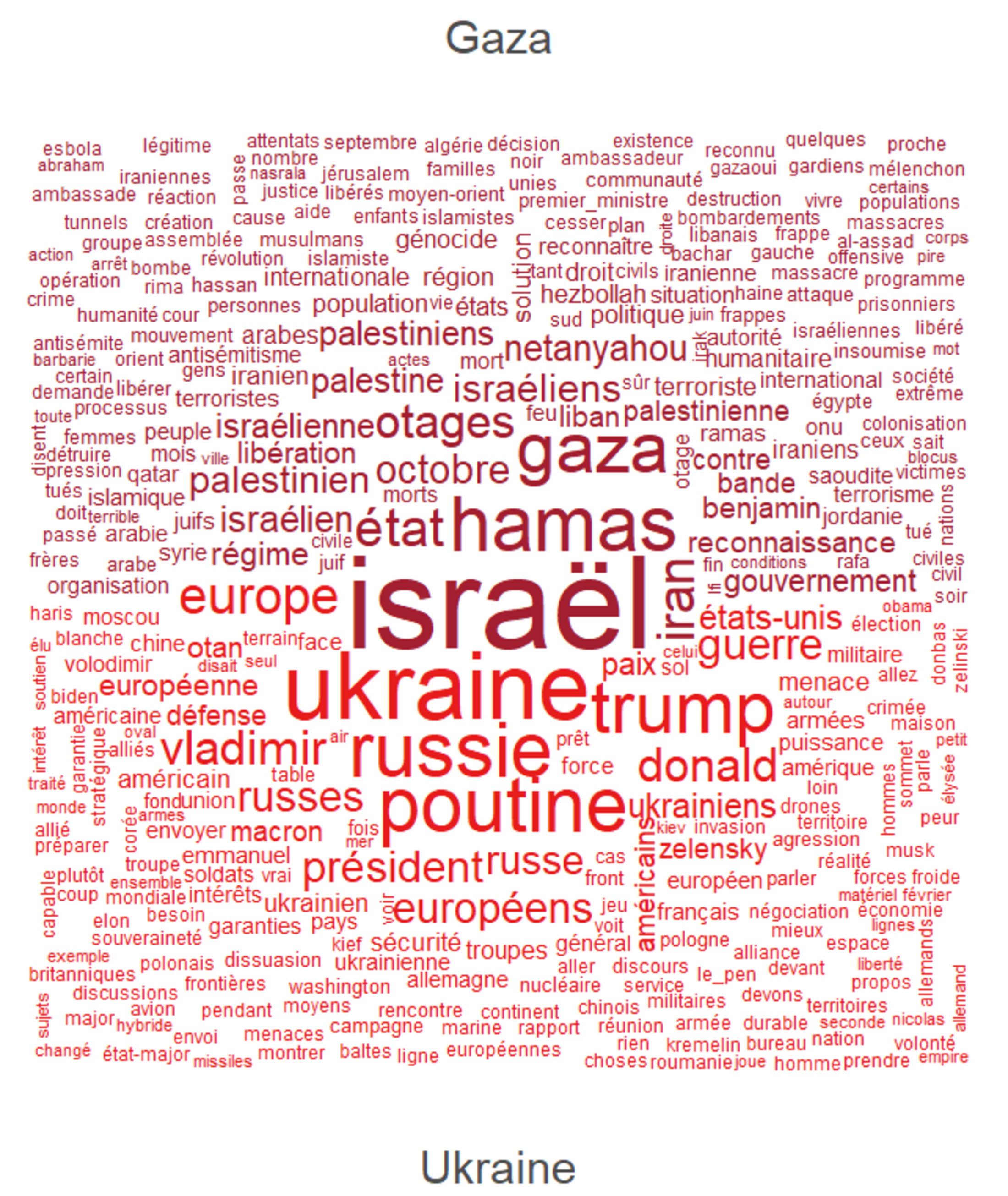 La catégorie Gaza regroupe les segments portant sur le génocide en cours à Gaza et le contexte régional associé. Les mots les plus fréquents renvoient à Israël, Hamas, Gaza, à la guerre, aux otages et aux acteurs étatiques impliqués. Les discussions incluent également des références à l’Iran, aux tentatives d’accord ou de paix, ainsi qu’à des réactions internationales.