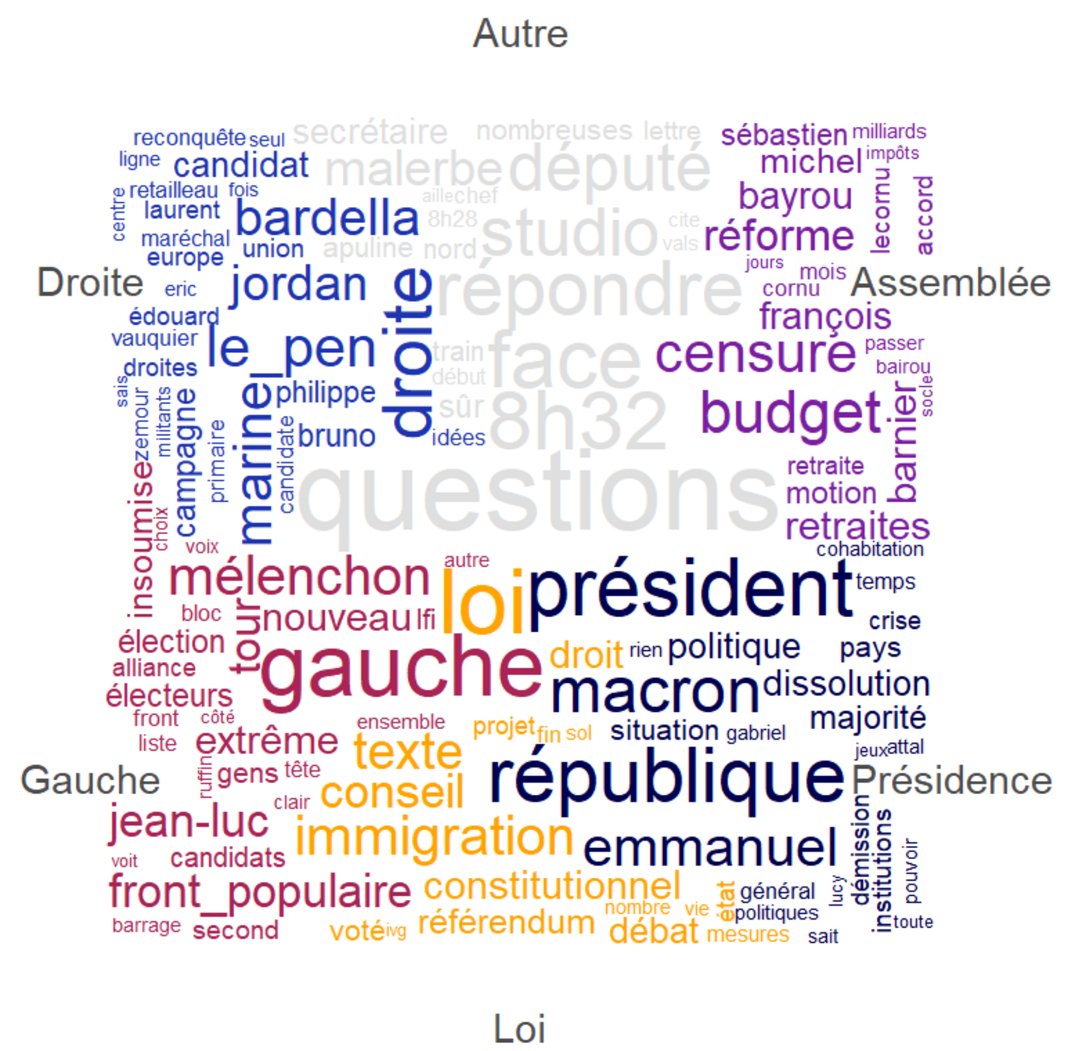 Une catégorie Autre rassemble des segments politiques plus ponctuels ou transversaux, souvent liés à des formats d’interview ou de questions-réponses (questions, répondre, studio, 8h32). Il semblerait qu'il s'agisse de lancement d'émission, mais une analyse complémentaire serait nécessaire.
