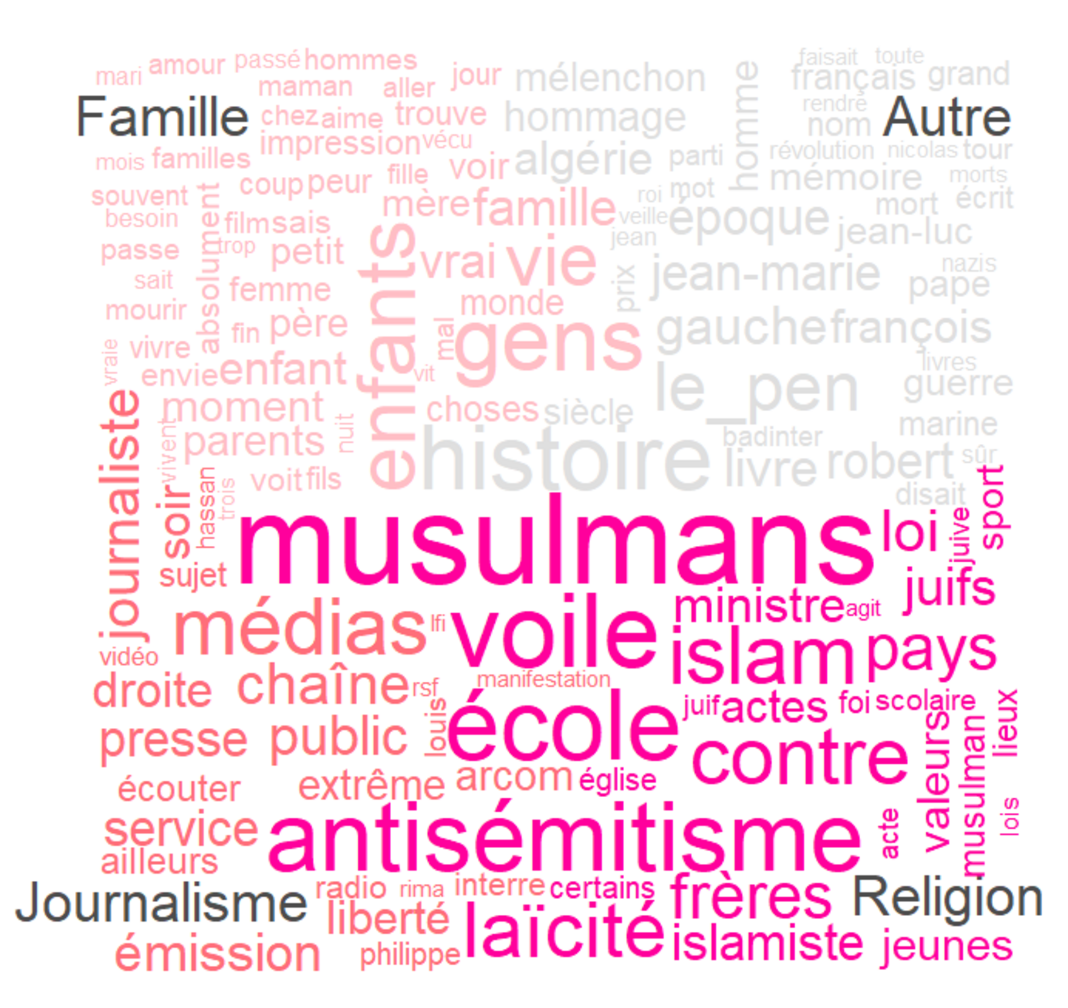 La catégorie Religion regroupe les segments liés aux questions religieuses et laïques dans l’espace public. Les mots les plus discriminants renvoient à l’islam, aux musulmans, au voile, aux juifs, à l’antisémitisme, à l’école. Les discussions portent généralement sur les tensions entre pratiques religieuses, principes républicains et politiques publiques, souvent dans un cadre conflictuel ou polémique.