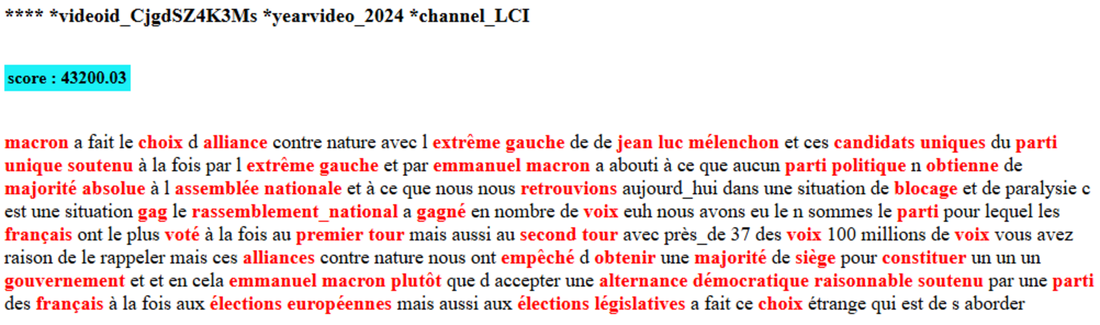 Pour dépasser cette limite, il est nécessaire de replacer les mots dans leur contexte d’usage. J’ai donc découpé les vidéos en segments d’une minute, ce qui permet de regrouper les mots en blocs relativement homogènes d’environ 200 mots. L’ensemble du corpus est ainsi constitué de 80.248 segments.