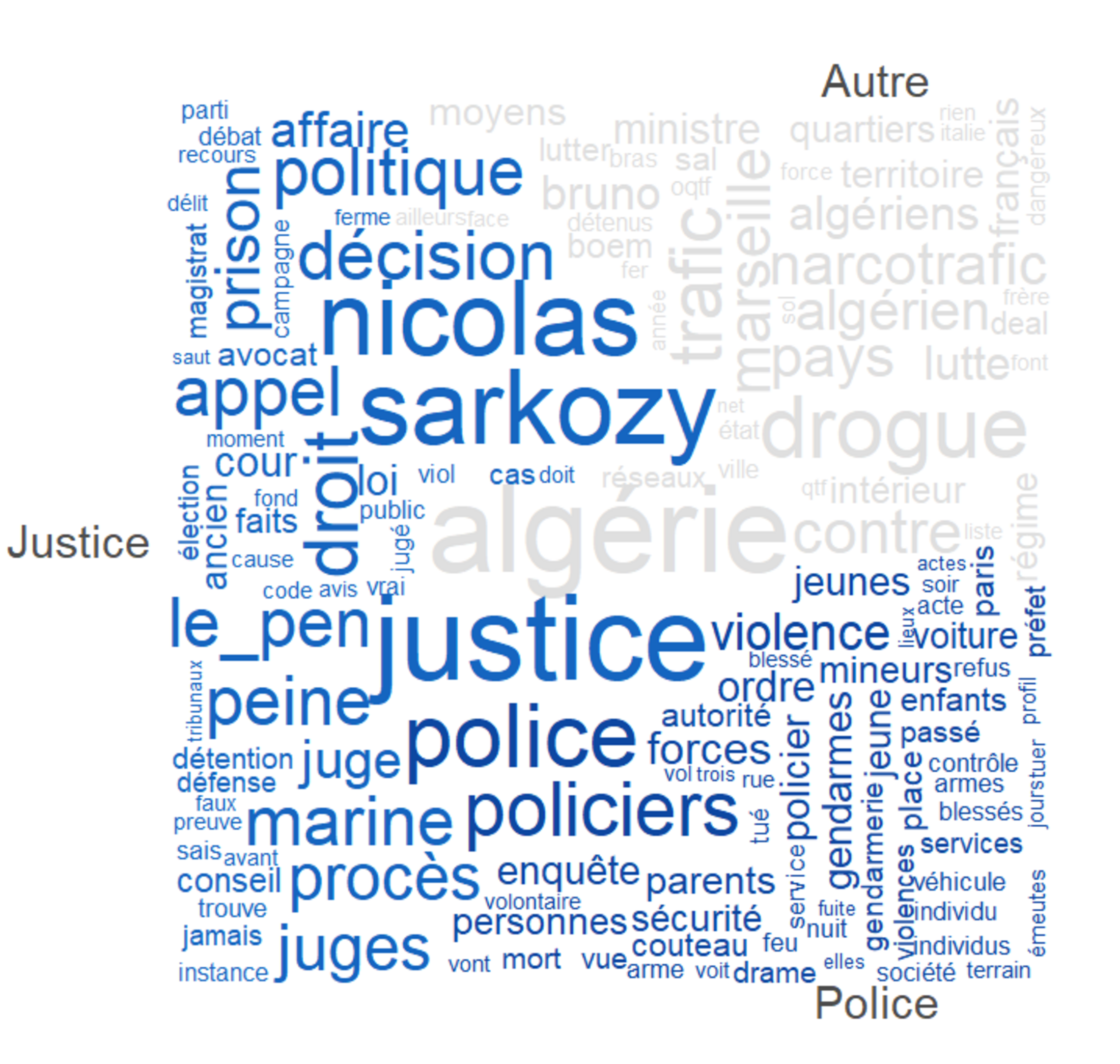 La catégorie Police rassemble les segments portant sur la justice comme institution et sur les questions de sécurité publique. Le vocabulaire est centré sur la police, les policiers, la sécurité, la violence, l’ordre public et le rôle de l’État. Les discussions concernent fréquemment la gestion de la sécurité, les réponses institutionnelles à la délinquance, ainsi que les débats politiques autour de ces enjeux.