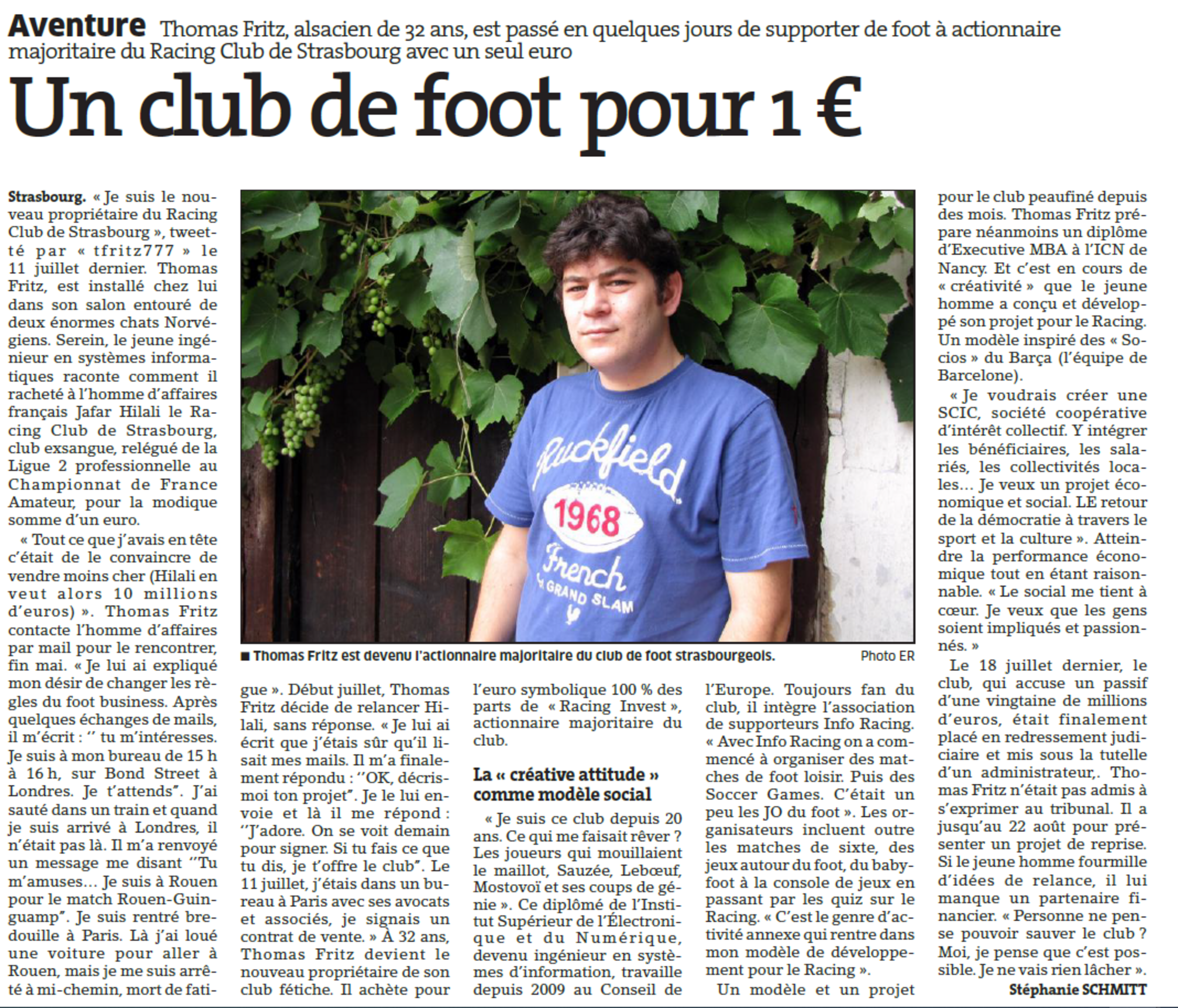 « Thomas Fritz, installé chez lui, serein, raconte comment il a racheté à l’homme d’affaires Jafar Hilali le Racing Club de Strasbourg, club exsangue et relégué, pour la modique somme d’un euro. »]