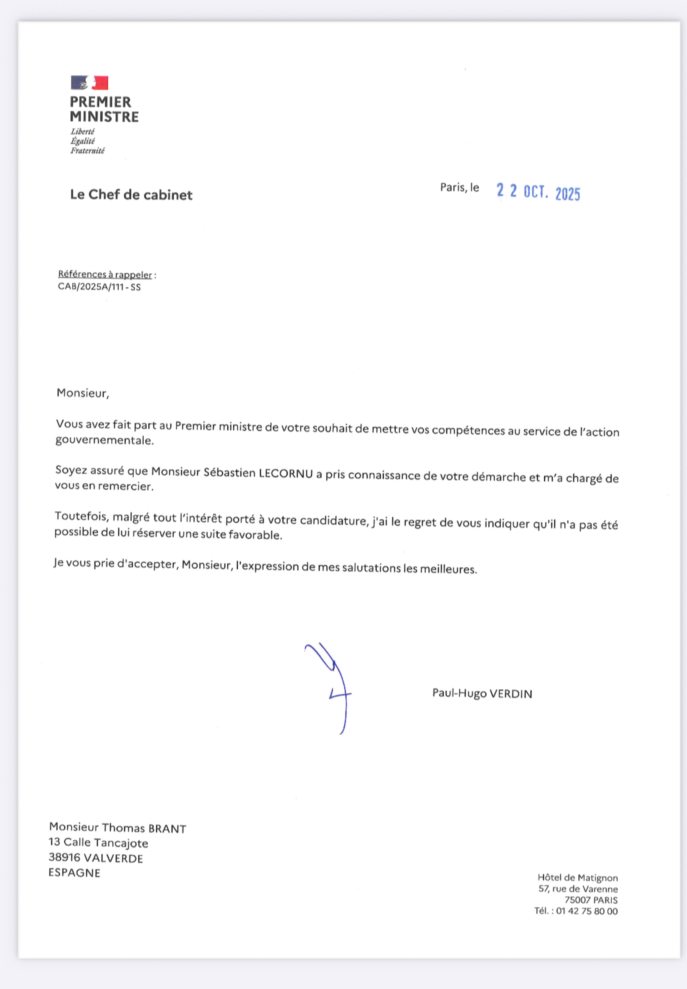 Une lettre standard, polie, impersonnelle, signée par un chef de cabinet. Pas un mot sur les idées, pas la moindre ouverture, aucune considération pour la démarche.