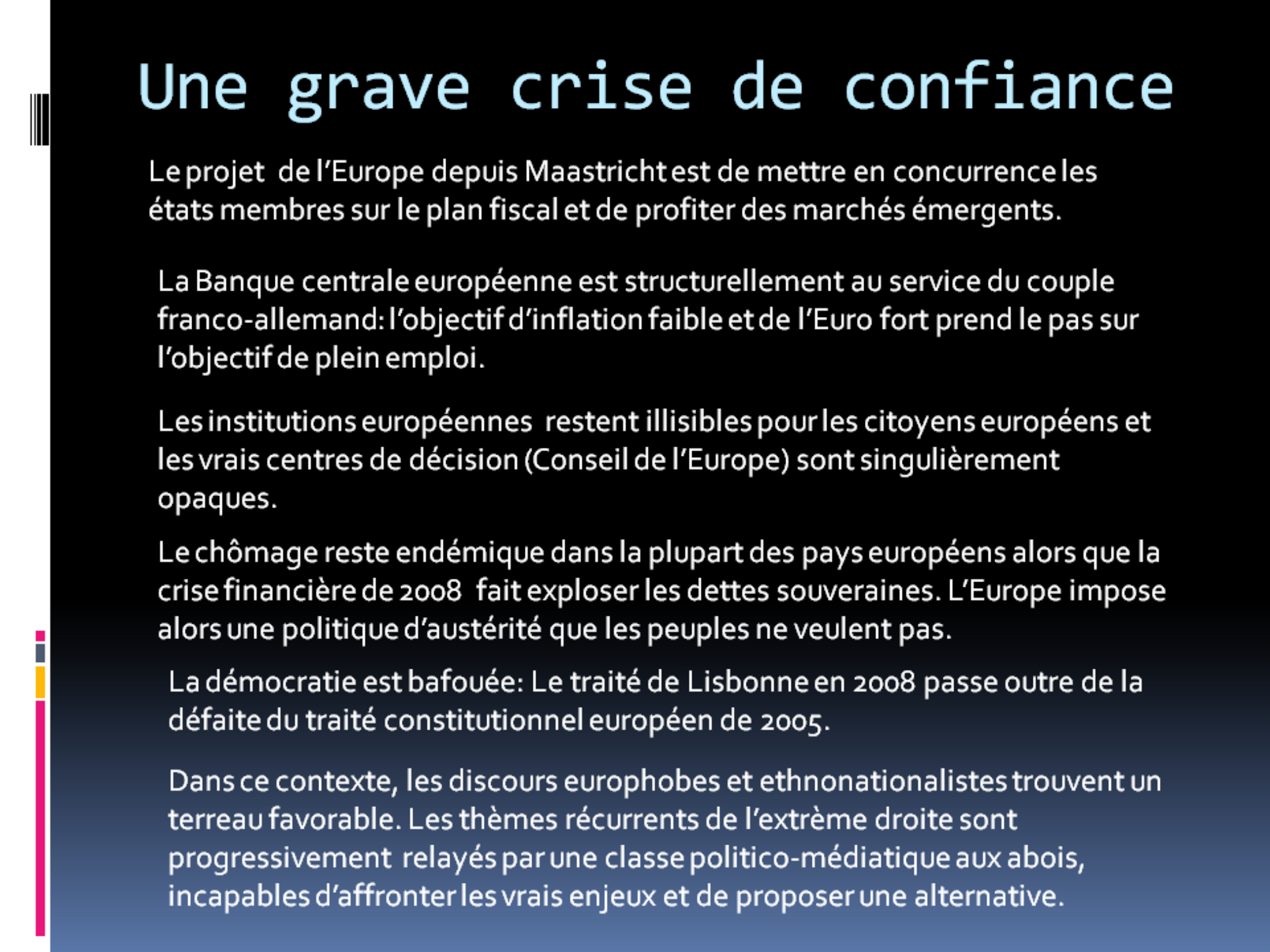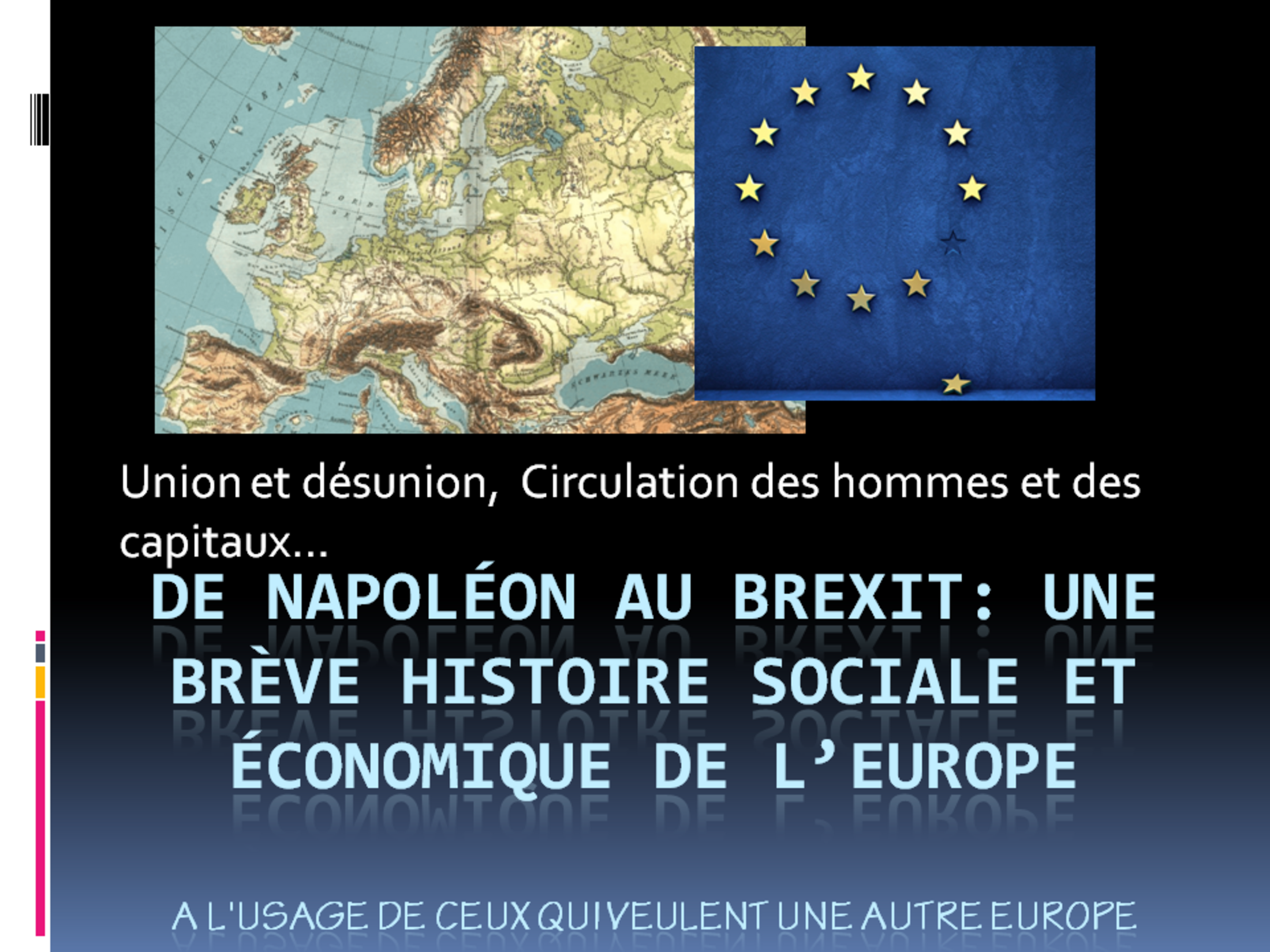 Ce projet ambitieux est à l'origine un diaporama ancien que j'ai remanié en la circonstance (Brexit). Le point de vue choisi est celui de la circulation des capitaux et des hommes, c'est donc une histoire politique et sociale que je propose ici. Il vise à faire réfléchir sur notre avenir.