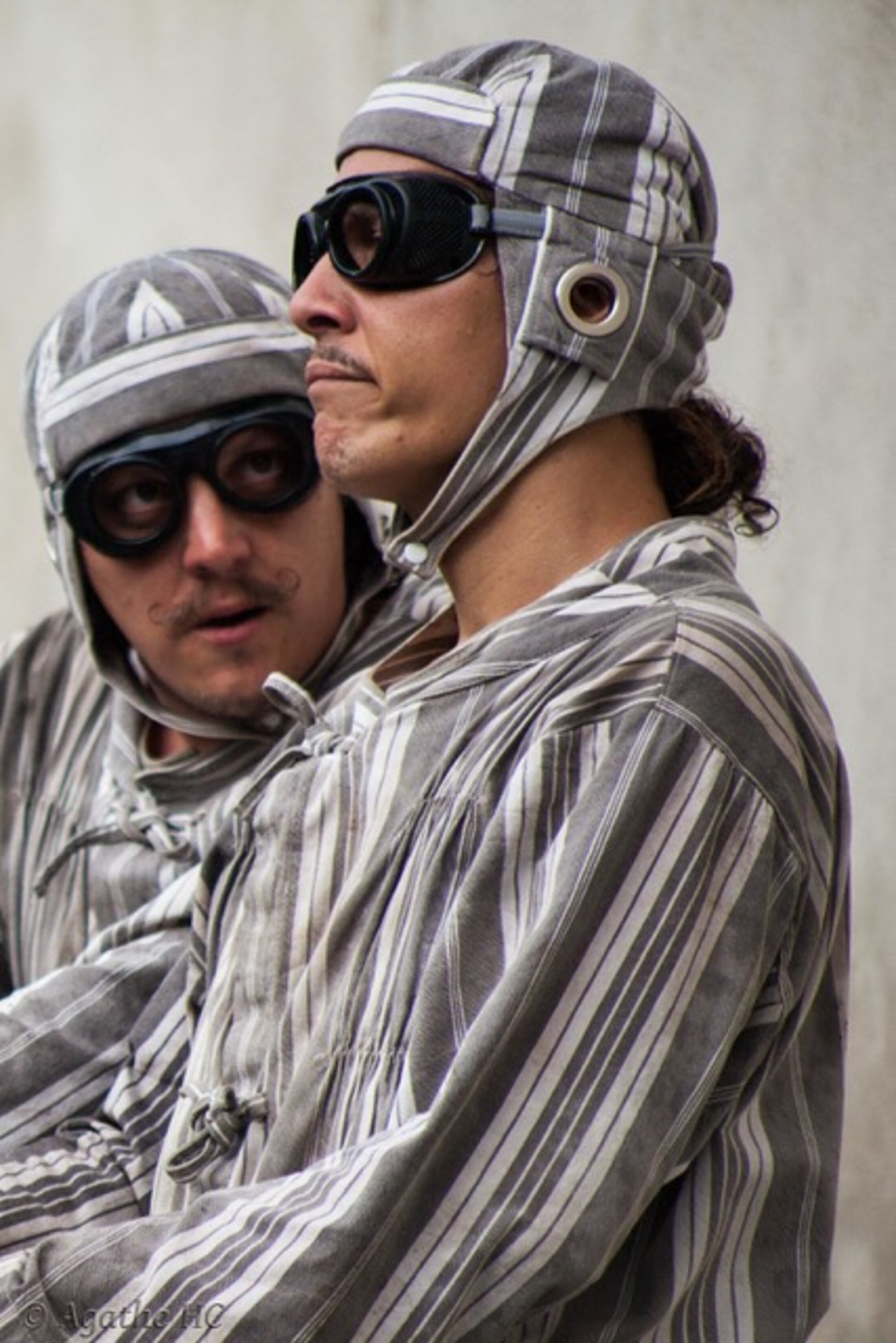 Ou de ce bagnard qui compte double, ils sont deux, ils sont habillés pareil ils ont des costumes matelassé, il portent des lunettes d'aviateur ; c'est apparemment loufoque on se dit ça va être des gags, ça va être des gags, bon voilà, puis on peut rire grossièrement aux gags. Et c'est d’une légèreté folle, quand ils tractent ils poudroient Avignon par des plumes et la plume c'est ce qui va conclure peut-être le festival, mais en tout cas leur spectacle ; donc ils impriment une énorme légèreté pour dire quelque chose de grave, c'est qu'il y avait des bagnards.