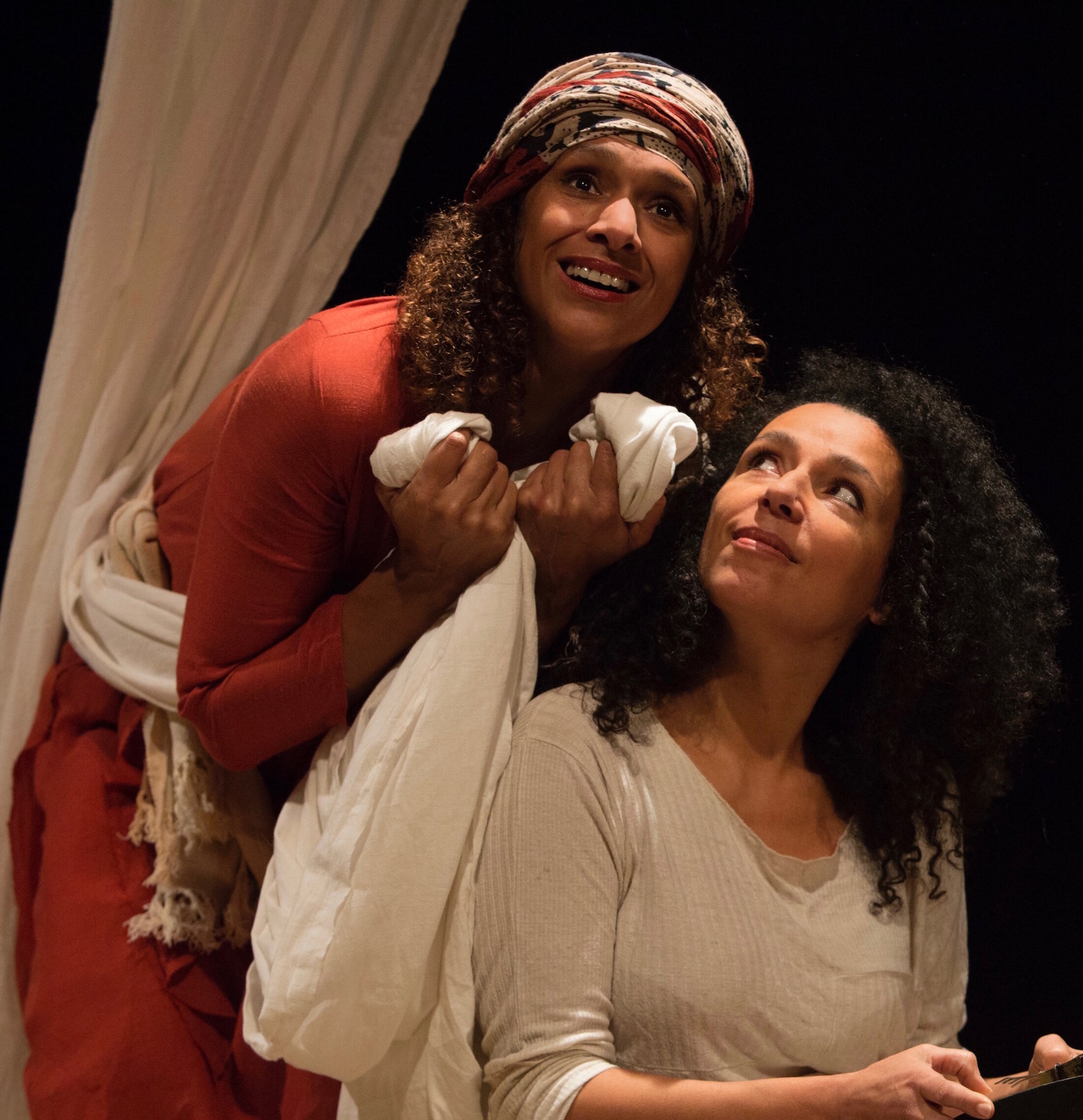 Donc, cette dernière nuit sera consacrée à dévoiler la vérité. Mais elle fait ça avec une grande douceur, et ce qui est très beau dans le spectacle, c’est que ça se partage entre une comédienne et une chanteuse, et elles sont absolument équivalentes. À un moment donné, la mère dit « j’ai accouché deux fois : une fois j’ai accouché de toi, et la deuxième fois en te racontant toutes ces histoires, j’ai accouché aussi de moi, donc je suis comme double ». Et la metteuse en scène a eu l’idée, la belle idée, de dédoubler le personnage avec une chanteuse. Donc on a des chants en créole (parce que Lyonnel Trouillot est un grand auteur de Haïti), on a des chants, comme ça, des Antilles, et aussi pas mal de musique, et au niveau de la décoration, ils ont essayé de féminiser complètement cette décoration, en même temps avec des tissus, des voiles, mais aussi avec le personnage d’erzulie, qui est un personnage du vaudou, qui est la femme, la femme à double tranchant (la bonne mère et la mauvaise femme, qui sont deux erzulies, mais qui peuvent aussi… enfin c’est un personnage binaire en fait, ambivalent). Donc il y a des sculptures, c’est très délicat, tout est très délicat.
