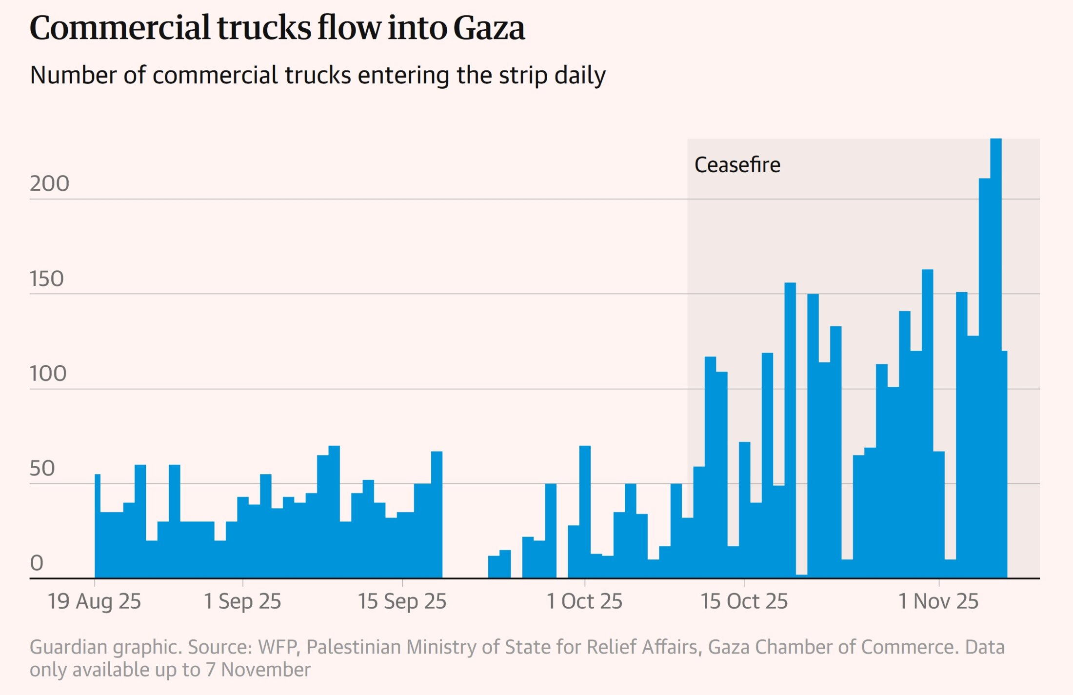 Dans le même temps, les livraisons non onusiennes, notamment les fournitures commerciales et les livraisons en provenance des pays arabes, ont augmenté à un rythme plus rapide. Selon les chiffres du Programme alimentaire mondial, les livraisons commerciales ont presque quadruplé, passant de 37 camions par jour en septembre à 144 camions par jour au cours de la première semaine de novembre.