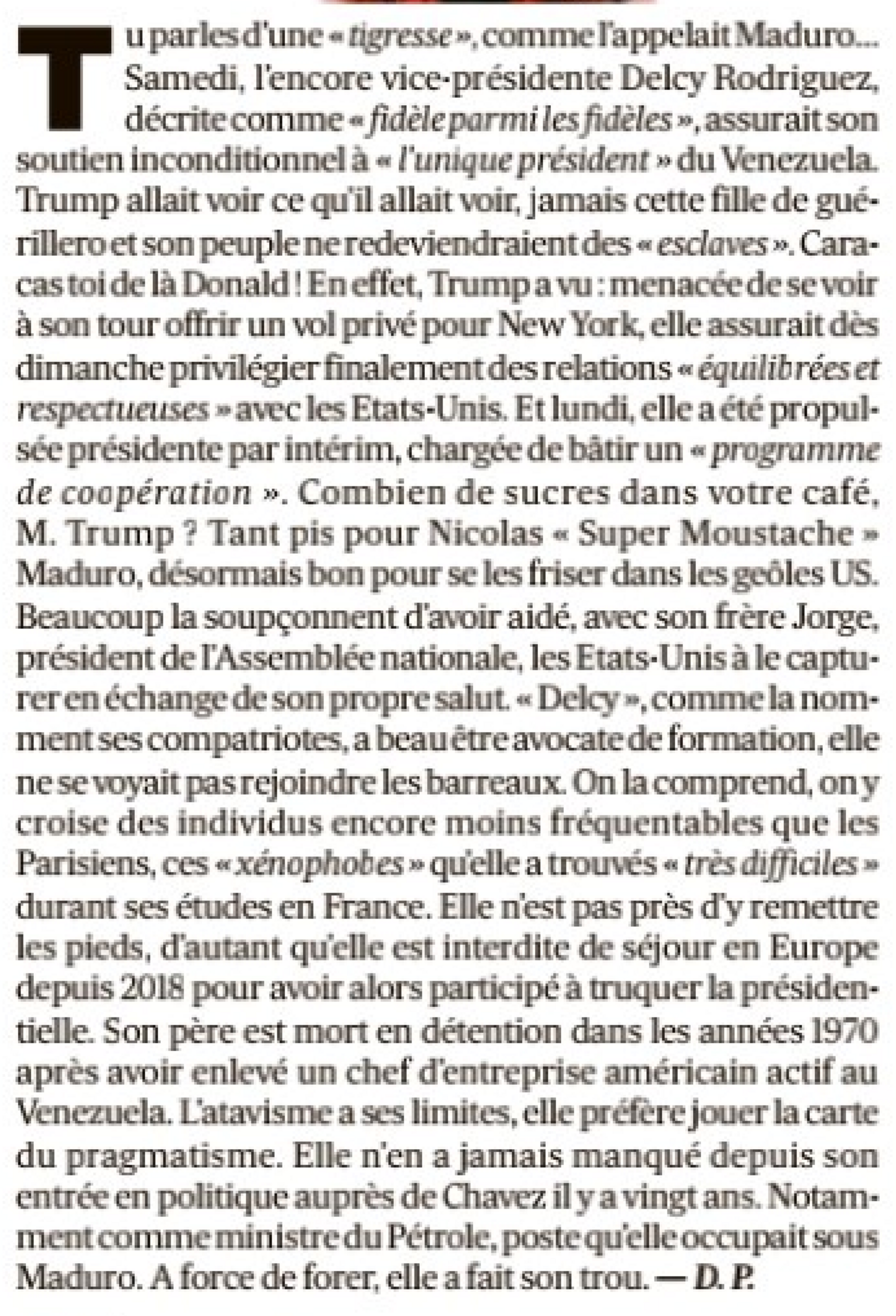 A propos du Venezuela les grands médias ont relayés avec gourmandise deux types d'information: d'une part autour de la spectaculaire opération militaire qui a permis de capturer Maduro, présentée comme un épisode de super Rambo TV notamment par Trump lui même :)