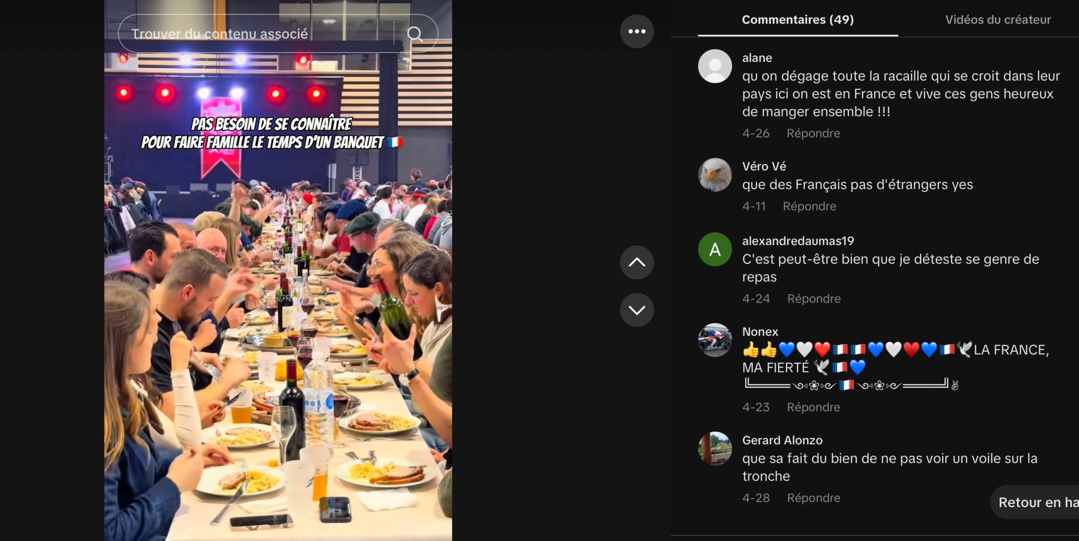 Si pour certains la teneur politique de l'évènement n'est pas évidente, elle apparaît clairement pour d’autres. Avant sa tenue, le banquet a été fortement relayé sur les réseaux sociaux par des comptes proches de l’extrême droite, qui l’ont présenté comme une réussite politique. Il ne m'a pas fallu faire beaucoup de recherches pour trouver des réactions devenues habituelles de ce côté du spectre politique. On retrouve la rhétorique désormais classique de la citadelle assiégée (« On veut nous interdire de faire la fête », « Bientôt on ne pourra plus manger français en France »). D’autres commentaires jouent explicitement avec le cadrage politique islamophobe (« J’espère qu’on y sert que du porc »). Ici, la fête n’est pas seulement une source de revenu pour l’extrême droite à travers PERICLES, elle semble aussi fonctionner comme un outil de mobilisation, en s’adressant à de potentiels électeurs sur des thématiques favorables aux partis d’extrême droite dans un contexte de campagne législative partielle.