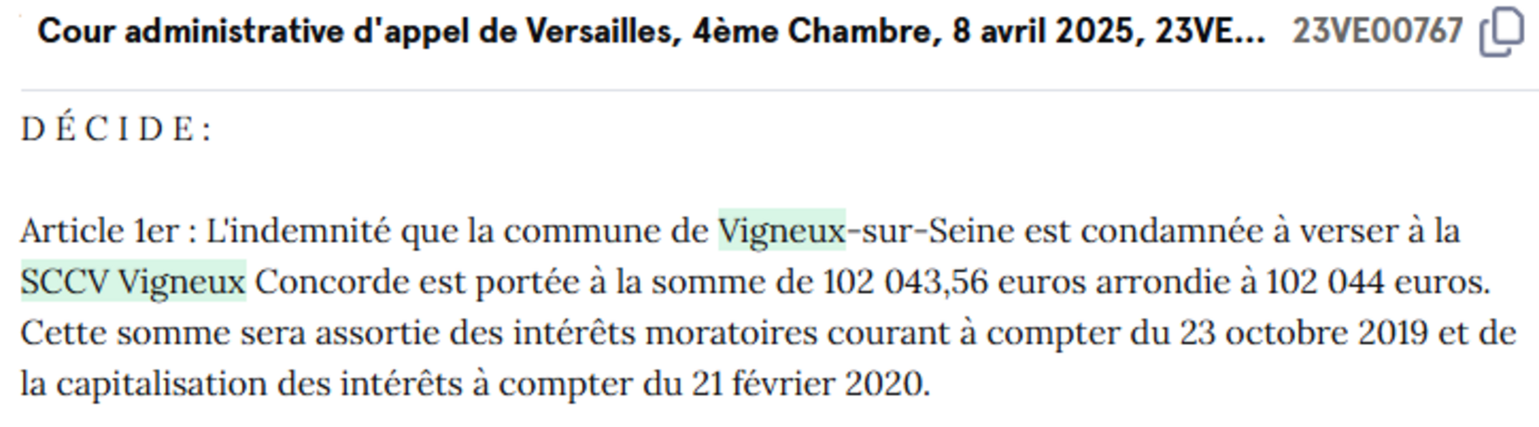 En effet, après l’annulation du premier permis, le successeur de Poinsot, le maire Thomas Chazal (LR), avait refusé le nouveau permis déposé par le promoteur, refus que le tribunal administratif a annulé en 2021. Au final, la cour d’appel a condamné Vigneux-sur-Seine à verser 102 044 € d’indemnités au promoteur – une somme sans commune mesure avec les 4,8 M€ demandés, mais bien supérieure aux 1 000 € initiaux. Cette décision en appel, rendue en avril 2025, fait payer à la commune la « faute initiale » de l’ancien maire… et l’entêtement de son successeur.