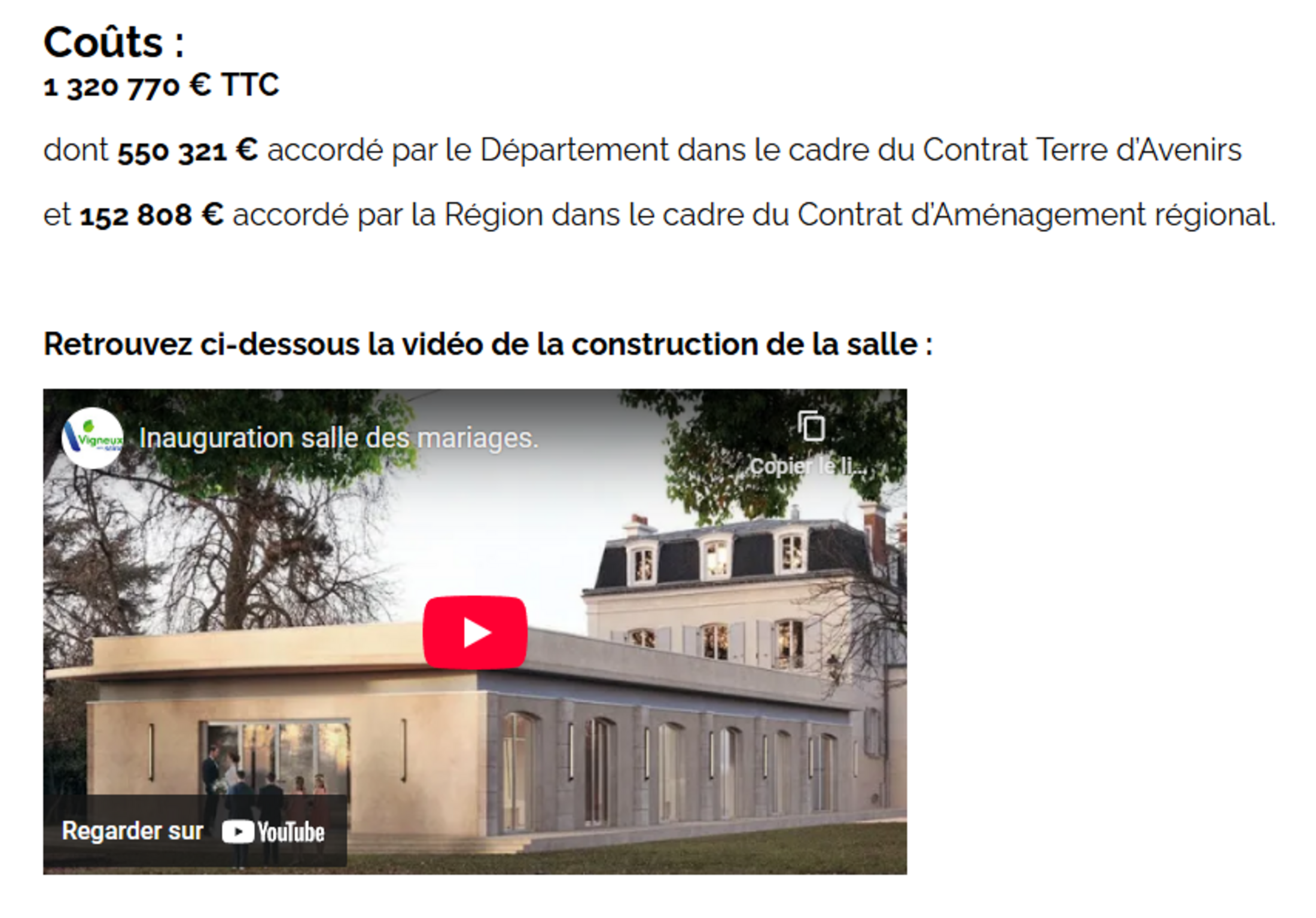 D’autres réalisations locales ont connu des sorts similaires. La rénovation de la salle des mariages qui devait doter Vigneux d’un espace cérémonial moderne dans le parc du Château des Acacias, pour 838 000 € prévus (vigneux91.fr) a pris du retard et peine à voir le jour. Par ailleurs, le cout passe de 838 000€ à 1 320 770€.