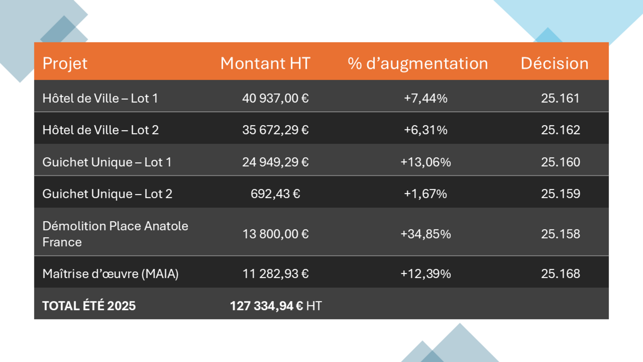 Enfin, la décision n°25.168, en date du 23 juillet 2025, vient revaloriser les honoraires du cabinet MAIA, maître d’œuvre du projet Hôtel de Ville, en raison des "aléas" rencontrés.