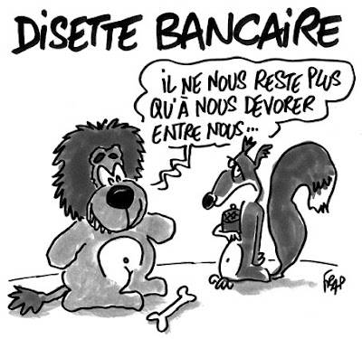 Oui, ces voleurs, les Banksters, avec leur système de découvert, leurs taux d'agios, leurs commissions d'interception ("intercepter", j'aime trop le mot ! Si proche du sens "voler", plus fort même : prendre sans se faire prendre...) et leurs crédits révolving, le révolver du pauvre, celui qui l'achève, des fois qu'ils n'auraient pas réussi à tout lui prendre sur son compte bancaire, LEUR COMPTE BANCAIRE. Trop pauvre pour avoir droit à un crédit avec un taux d'intérêt classique mais suffisamment pauvre, "soumis", "contraint" pour accorder un crédit-révolving à un taux proche de celui du taux d'usure, quasi-usurier, quasi-ordurier dans l'ordre moral de l'humanité à un pauvre hère.