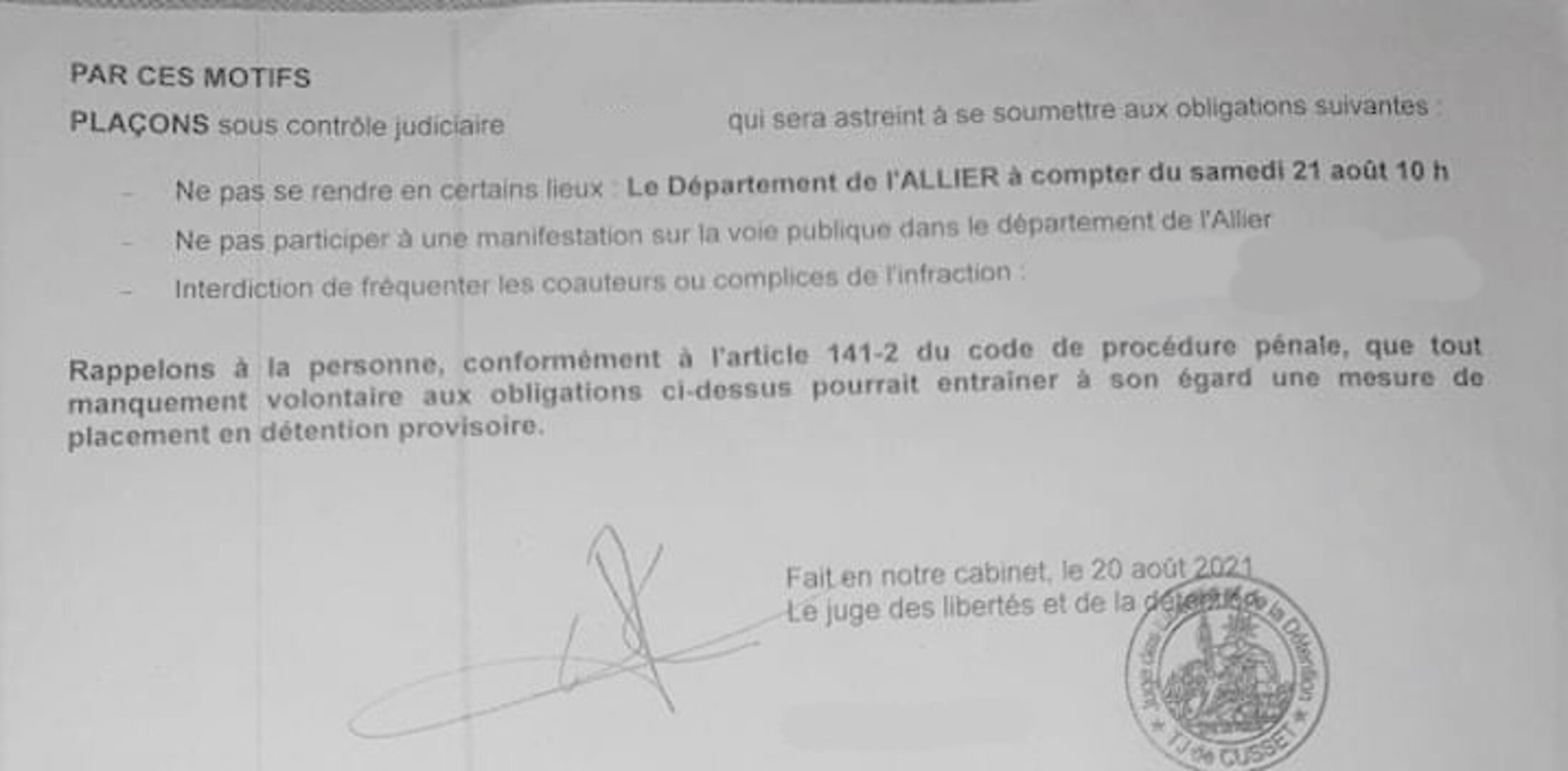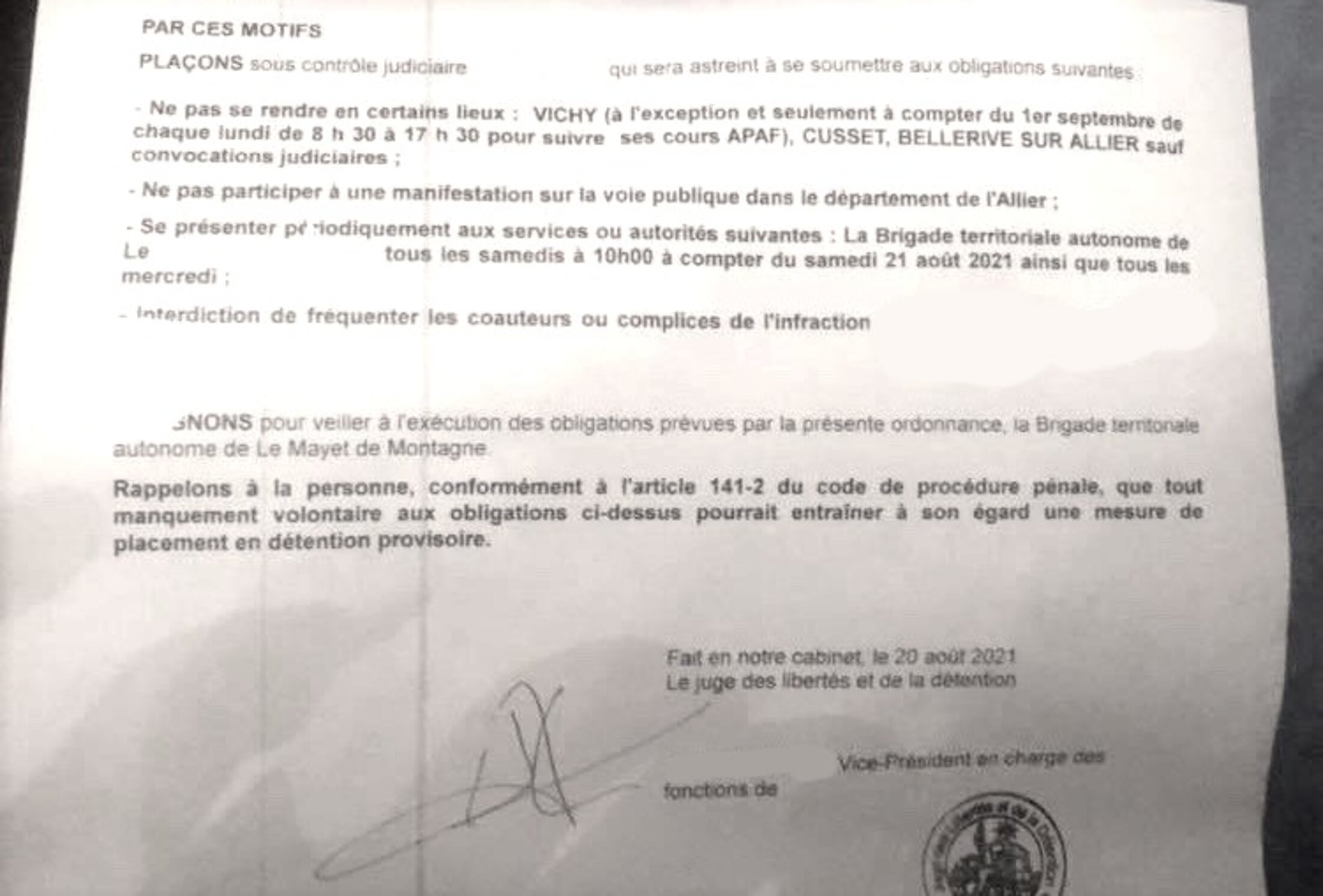 Quoique présumé innocent, Isham D.*, 22 ans, modeste employé dans la restauration, a dû immédiatement quitter le département de l’Allier et a été, de facto, expulsé de son lieu de résidence (cf document). Son contrôle judiciaire en fait donc un Sans Domicile Fixe. Depuis il navigue précairement entre ceux, amis et famille, qui veulent bien l’héberger : « Je n’ai même pas eu le temps de dire au revoir », regrette-t-il.